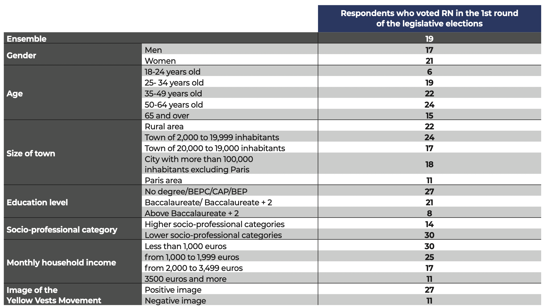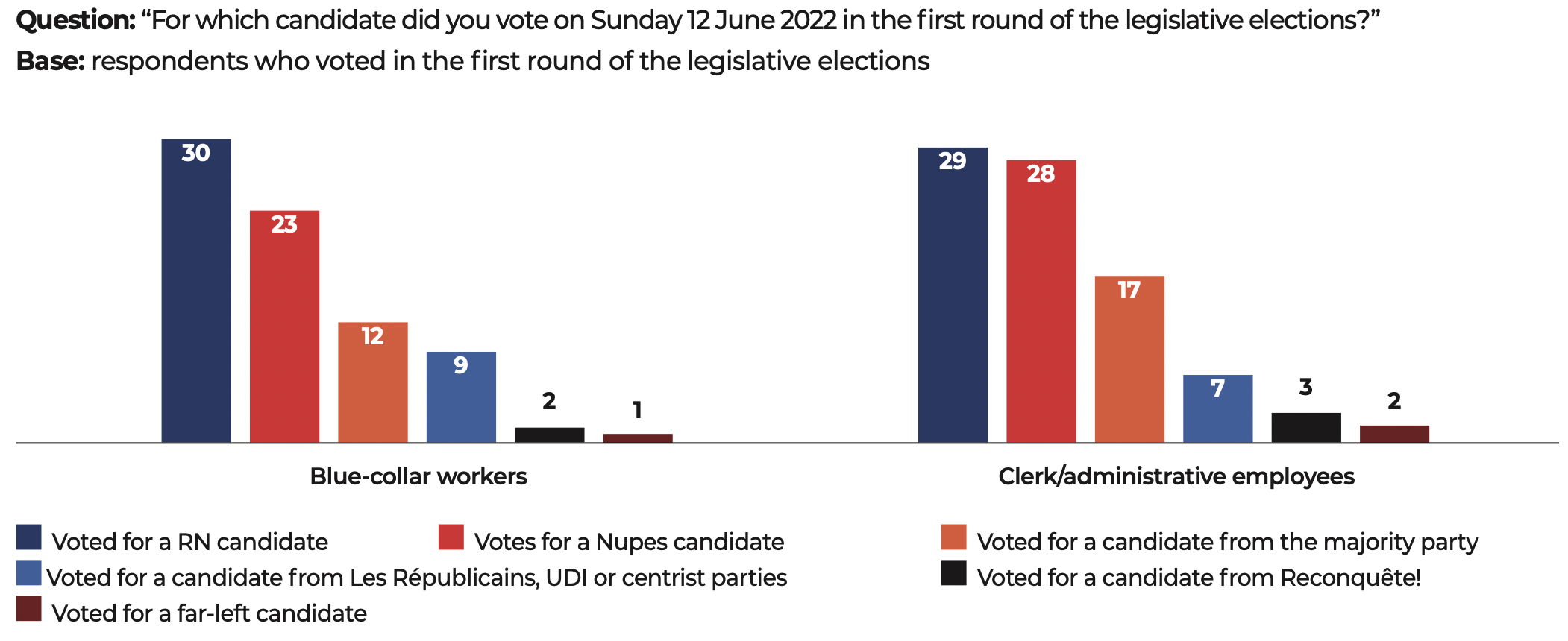 2. As it grows, the RN’s electorate is diversifying. It is growing in towns with more than 100,000 inhabitants (excluding Paris), where its share (18%) in the first round of the legislative elections is the same as the national average (19%). The RN vote is growing in the upper social categories: between the first round of the 2017 parliamentary elections and the 2022 parliamentary elections, the RN (or previously Front National) vote among white-collar workers has risen from 5% to 13%, and the vote among those with intermediate professions rose from 11% to 16%.