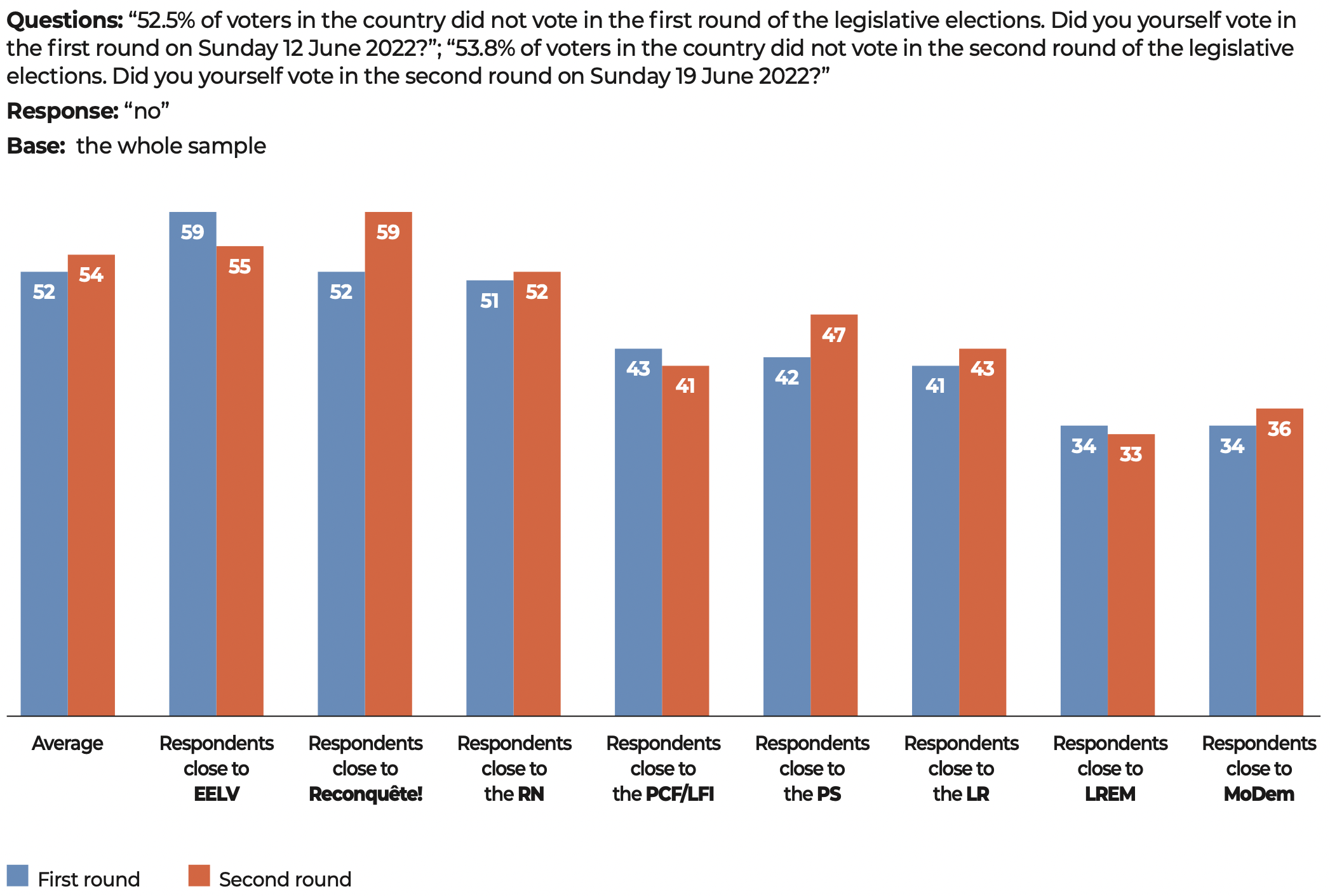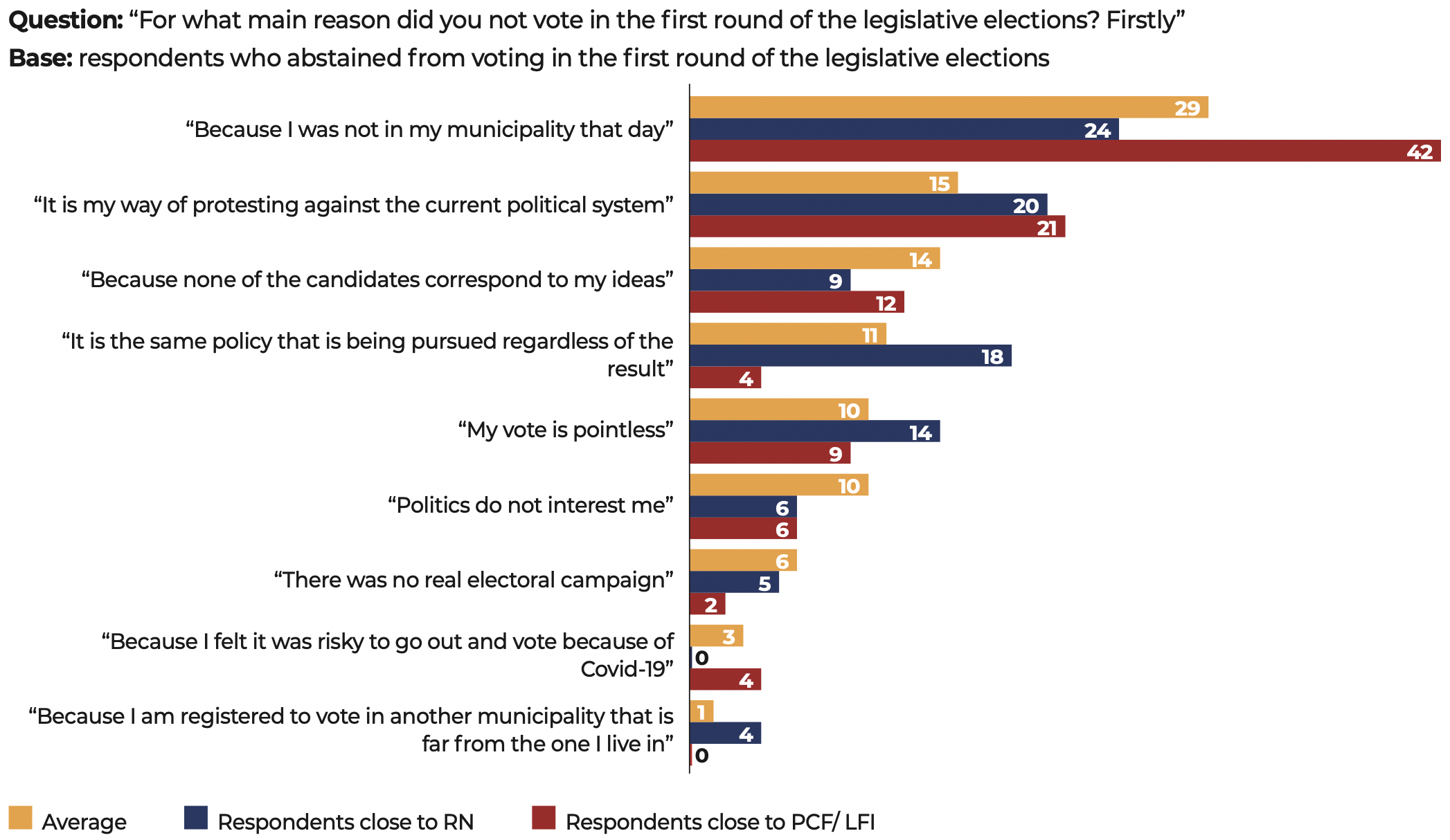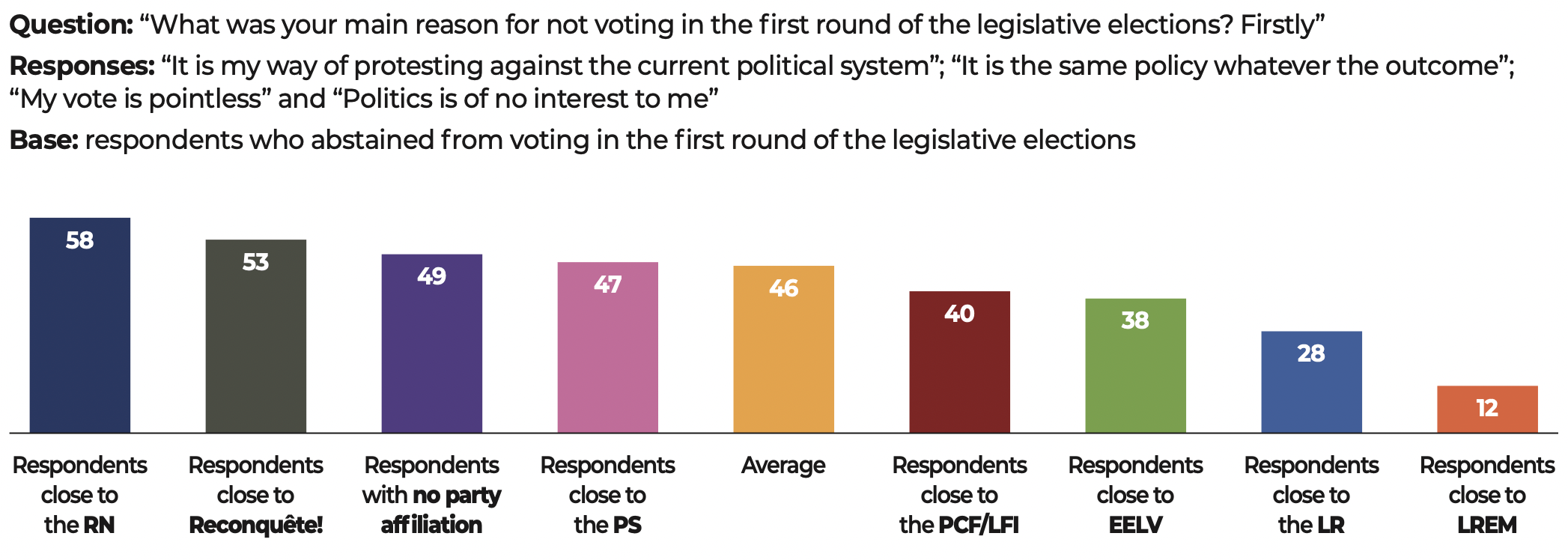 4. In a major upset, the RN became the first opposition group in the National Assembly. However, only 55% of Marine Le Pen’s voters in the first round of the presidential election voted in the first round of the legislative elections. The abstention f rom voting disguises a larger share of the vote for the RN. In fact, 58% of voters close to the RN who abstained from voting justify this abstention with a protest motive, against 46% of abstainers on average and 40% of abstainers close to the French Communist Party (PCF) or the France insoumise (LFI).