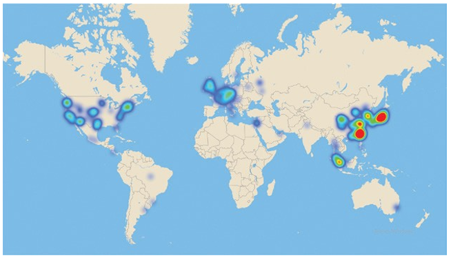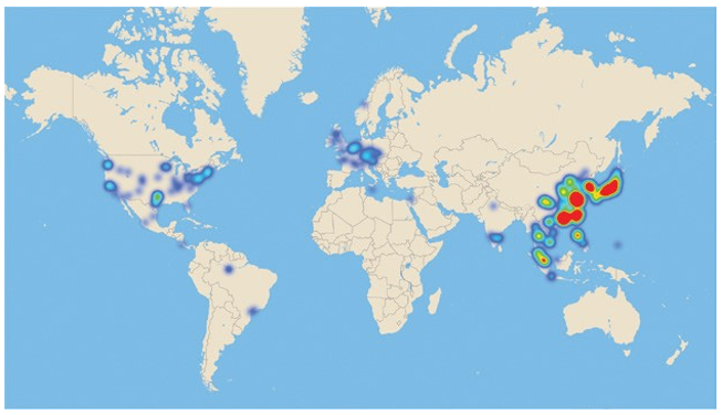 The heat map shows the location of the fabs referenced in the Wikipedia database (link below). No weighting is applied to the geolocation data of the production sites because it is not possible to rank all production units according to unique objective criteria such as production capacity or production technology.
