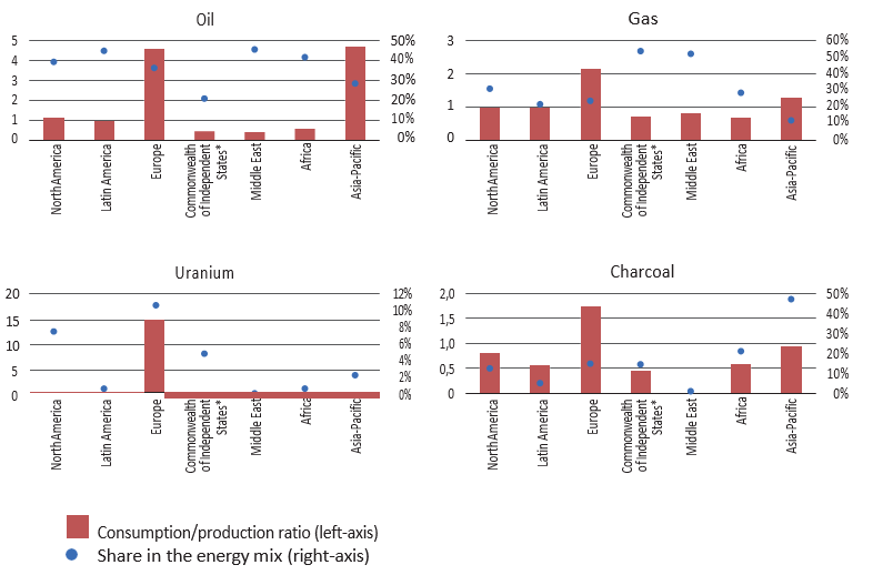 The energy we consume comes mainly from fossil (oil, gas, coal) and nuclear (uranium) fuels: 84% for France and 91% for the European Union. An analysis of world production of these fuels reveals, unsurprisingly, that Europe is highly dependent on imports for its domestic consumption.