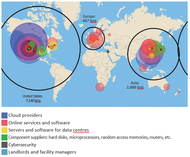 Each disk is centred on the location of the headquarters of the main listed companies of the cloud value chain. The surface area of a disc is proportional to the market capitalisation of the company (as of 12 July 2020), while its colour indicates the market segment to which the company belongs. The black circles correspond to the sum of the regional market capitalisations. A list of the companies represented can be found in Appendix B (page 44).
