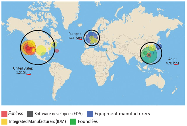 Each disc focuses on the location of the headquarters of the main listed companies in the semiconductor value chain. The surface area of a disc is proportional to the market capitalisation of the company concerned (as of 12 July 2020), while its colour indicates the market segment to which the company belongs. The black circles correspond to the sum of the regional market capitalisations. A list of the companies represented can be found in Appendix A (page 43).
