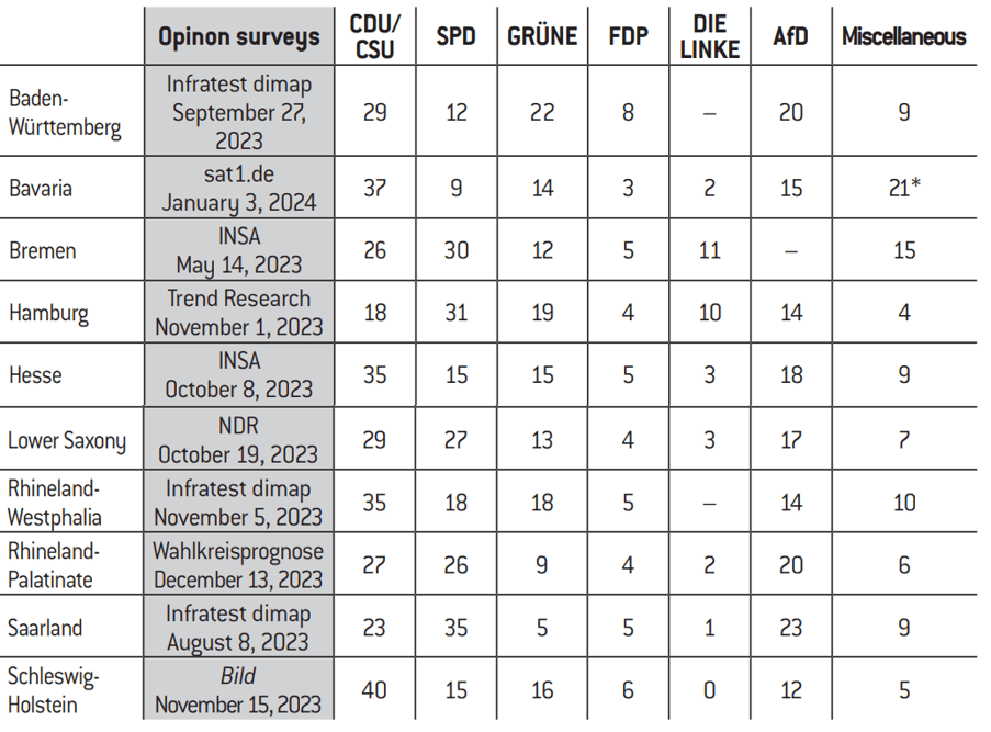 Note: The next elections for these Länder will be held in winter 2025 for Hamburg, spring 2026 for Baden-Württemberg and Rhineland-Palatinate, spring 2027 for Bremen, Rhineland-Westphalia, Saarland and Schleswig-Holstein, autumn 2027 for Lower Saxony, and autumn 2028 for Hesse and Bavaria.