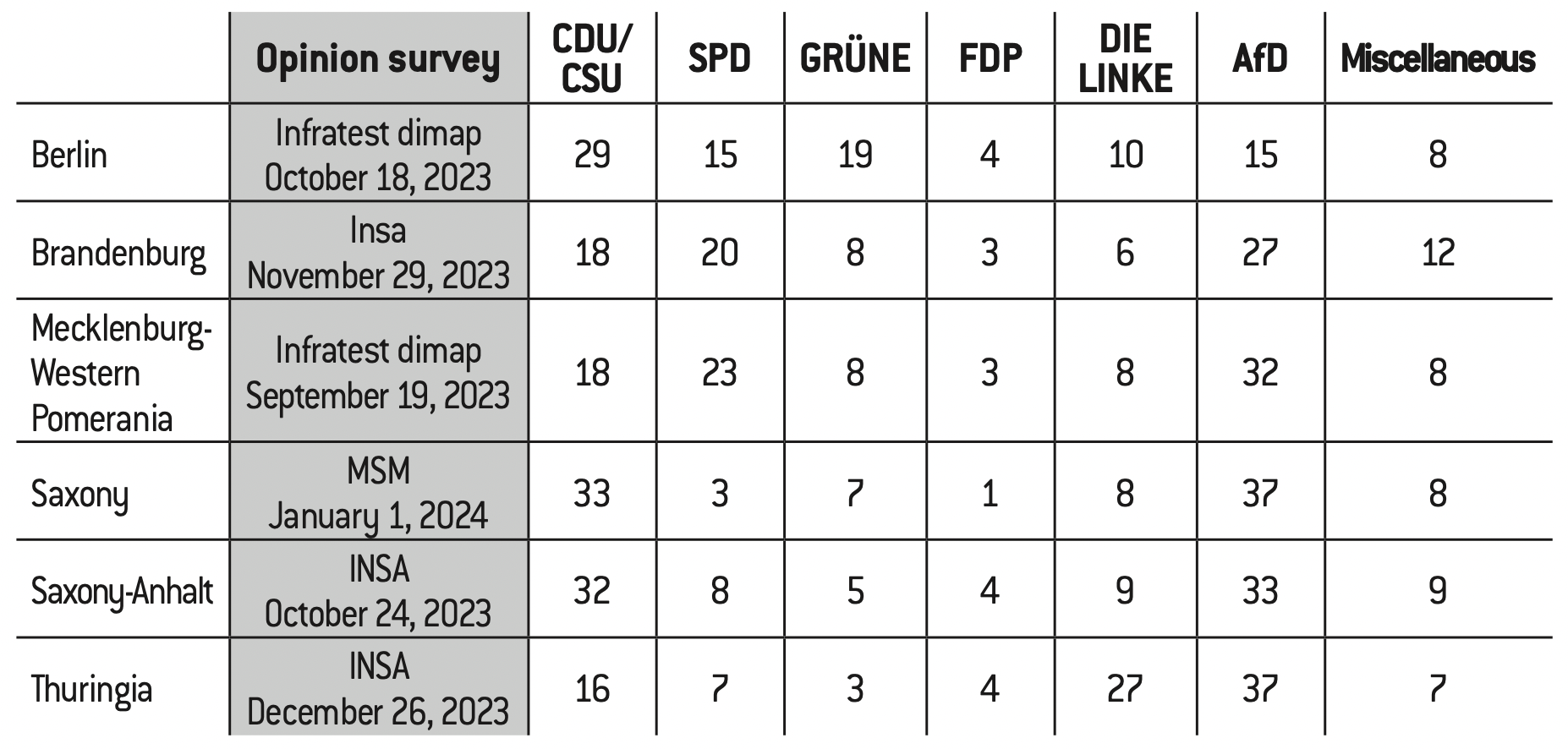 Note: The next elections for these Länder will be held in September 2024 for Brandenburg, Saxony and Thuringia, in summer 2026 for Saxony-Anhalt, and in autumn 2026 for Berlin and Mecklenburg-Western Pomerania.