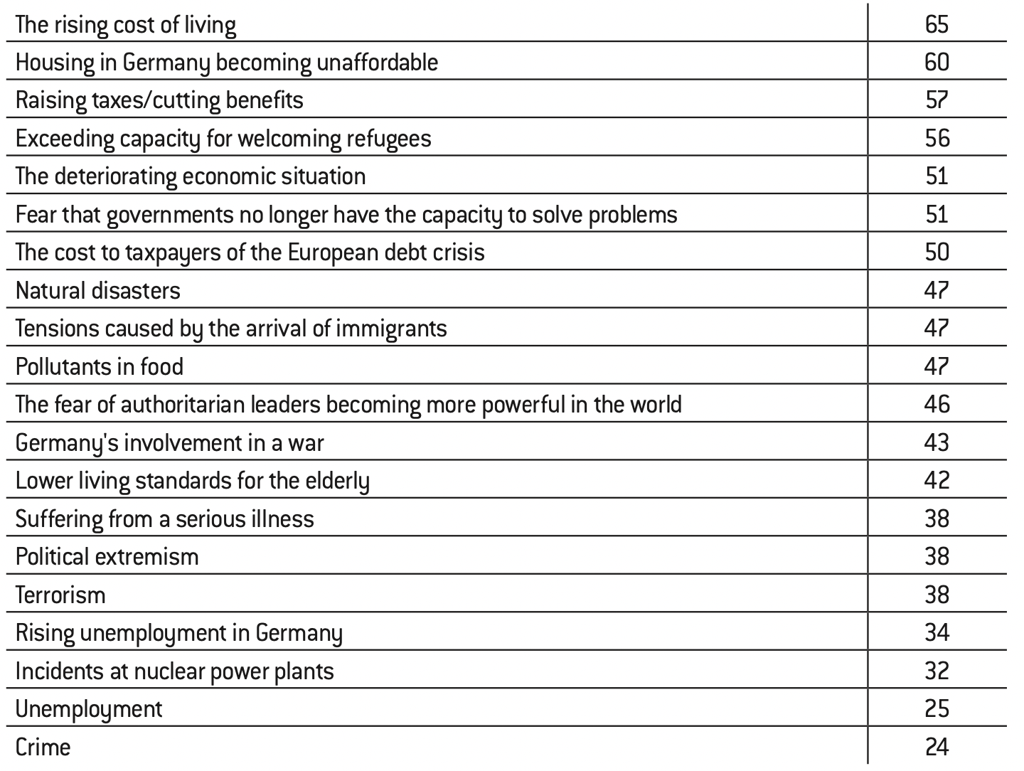 In 2021, a majority of Germans feared tax increases and benefit cuts as a result of the Covid-19 crisis. In 2022, inflation set in and reached its highest level for almost 50 years. By 2023, the rising cost of living was at the top of the list of concerns. Despite an unfavourable economic climate and negative predictions, the fear of an economic crisis decreases in 2023 (-6 percentage points). Talk of an ultimate crisis of capitalism is therefore only partially effective.