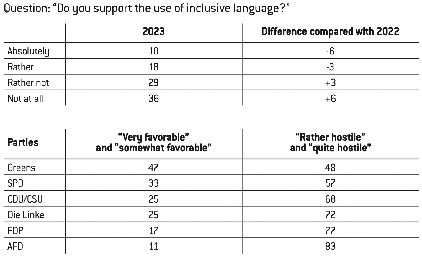 The INSA polling institute, which carried out a survey on the reception of the manifesto, showed that 39% of those questioned answered that they “agreed” or “somewhat agreed” with the text, while the same proportion (38%) rejected the approach. More women (45%) than men (34%) approved of the text. The manifesto is more widely approved in the former East Germany (48%) than in the West (37%). Supporters of Die Linke and the AfD were more likely to have a favourable opinion of the manifesto (67%)37.