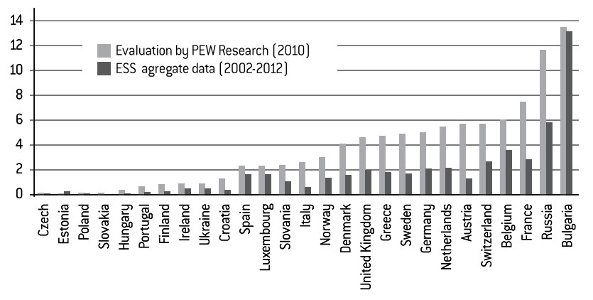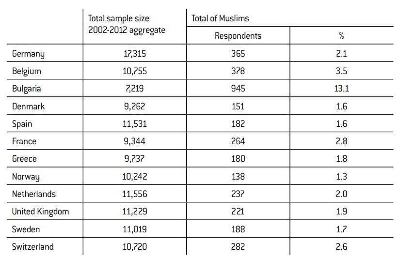 This under-evaluation of the number of Muslims compared with the Pew Research Center figures is not surprising. Surveys are known to chronically under-represent Muslims, something that can be explained for a number of reasons (difficulty of access, lower social integration, under-declaration, etc.), as has been shown in France.16 We also need to bear in mind that Muslim populations have only recently settled in Europe, which means that there will always be a natural difference between an estimation made at a certain given time (2010 for the Pew Research Center) and data gathered over a period of ten years (2002-2012). Indeed, the only correct estimation has been made in Bulgaria, where the Muslim presence has been established for longer.