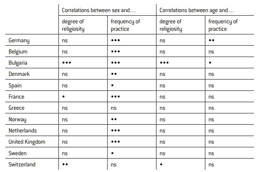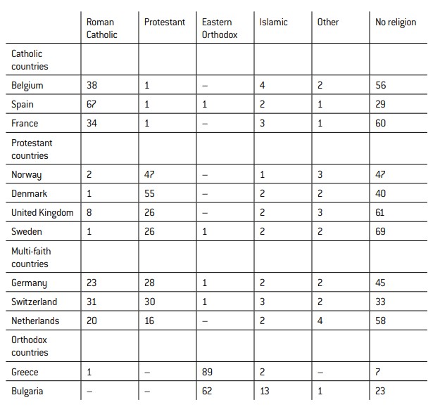 The analysis that follows will be limited to the twelve countries that provided a sample of at least 100 Muslim respondents (Table 1). The overall religious compositions of these countries vary considerably (Table 2). They can be classified into four main groups: traditionally Roman Catholic countries (Belgium, France, Spain), traditionally Protestant countries (Norway, Denmark, United Kingdom, Sweden), traditionally Eastern Orthodox countries (Bulgaria, Greece), and multi-faith countries (Germany, Switzerland, Netherlands). In the majority of these countries, secularisation is already at a very advanced stage, as demonstrated by the percentage of people who declare themselves to have no religion, which is very high in all apart from the Eastern Orthodox countries.