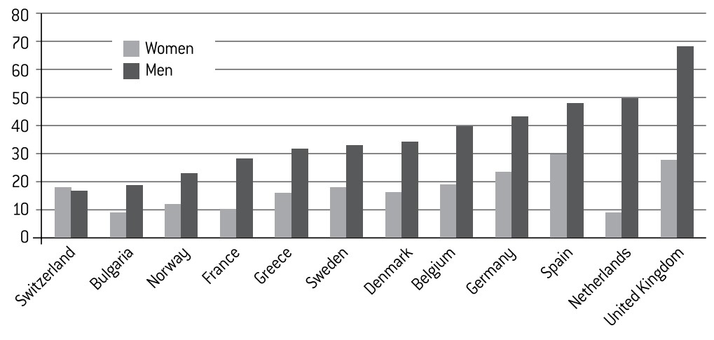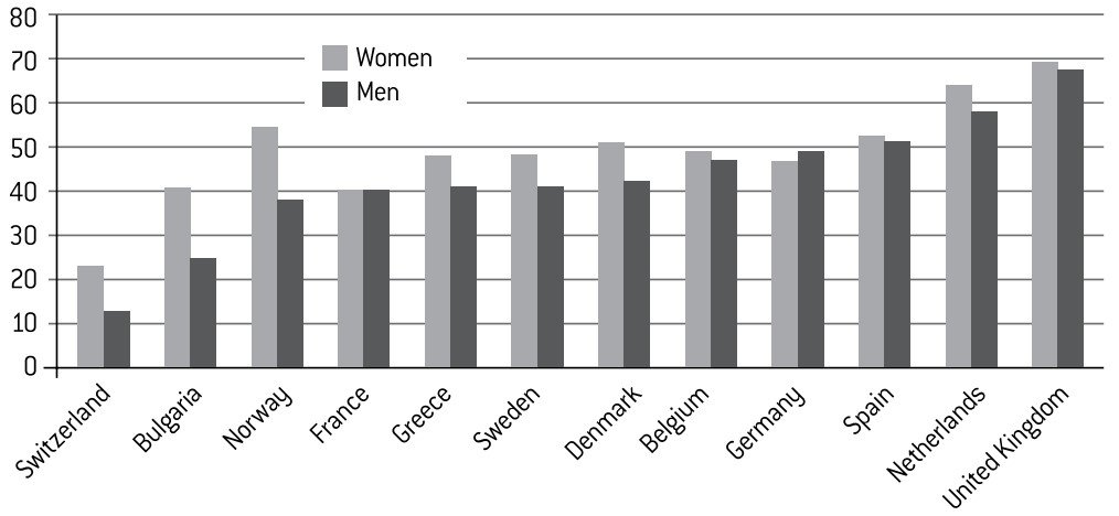 This difference between the sexes is all the more striking when we consider that, among Muslims, men and women display comparable levels of religiosity. Furthermore, they exercise very similar habits with regard to the daily prayer. Indeed, women tend to pray more than men (Graph 9). The European data confirms what had already been shown to be the case in France, by an IFOP survey in 2011, insofar as the ritual of the daily prayer was as common place among women (37% of whom claimed to pray every day) as among men (40%). On the contrary, only 16% of women regularly attended the Friday service at the mosque, as opposed to 35% of men.23