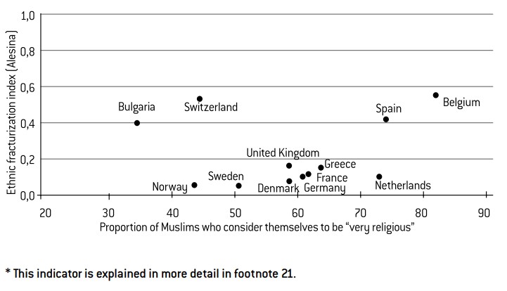 This militant dimension of Islam is obviously very important in the current climate, but the ESS data does not allow us to explore it in any depth. All we can do is to confirm whether there is a connection between religiosity and religious diversity. To do so, we will use the religious “fractionalization” index developed by Alberto Alesina.26 The analysis is not conclusive and agrees with Norris and Inglehart’s observations, which found that secularisation does not correlate to the absence of religious diversity. In other words, secularisation is not necessarily stronger in countries where one religion enjoys a monopoly. It must nevertheless be emphasised that the religious fractionalization index tells us nothing about proselytism or the competition between the different movements within the Muslim faith, and we are therefore unable to pass comment on this point. At the present time, an explanation relating to militant activism can be neither confirmed nor disproved, and such a notion must therefore be the subject of further investigation.