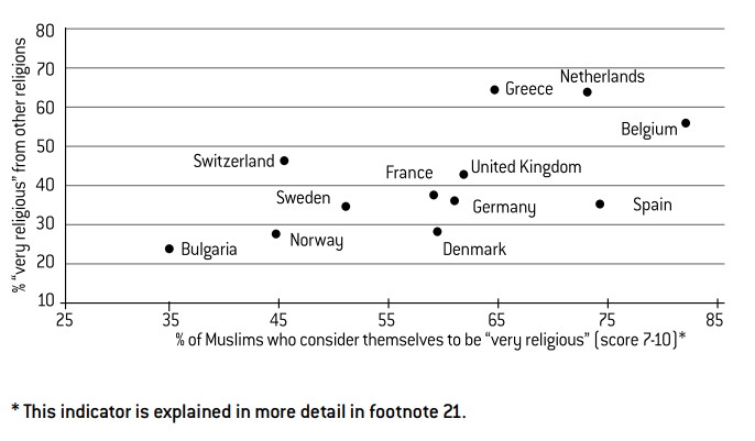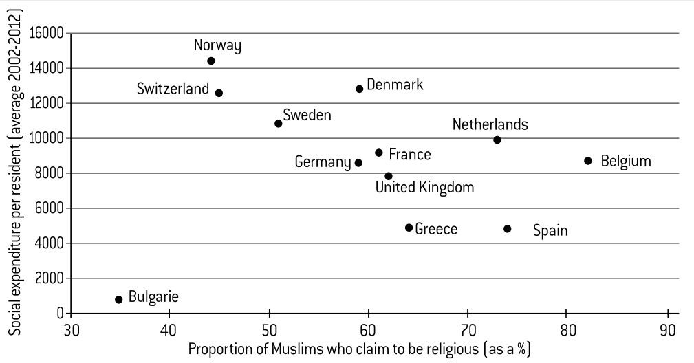 Obviously, this correlation does not serve as 100% proof. It surely masks numerous intertwined effects that are hard to unravel. For example, countries that boast a strong level of social security also tend to be those where Muslims enjoy a higher level of income. However, no correlation exists between degrees of religiosity and levels of income, which implies that social security is indeed the more decisive variable at play here, above that of household income.