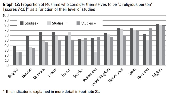 Graph 12: Proportion of Muslims who consider themselves to be “a religious person” (scores 7-10)* as a function of their level of studies