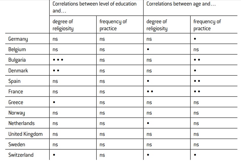 For Muslims, neither frequency of religious practice nor levels of faith appear to correlate with age, apart from Bulgaria where the youngest members of the Muslim population are considerably less religious than their elders (Table 3). This lack of correlation with age would seem to suggest that there is no intergenerational evolution to speak of; in other words, levels of religiosity and frequency of practice both generally remain stable, regardless of age. It is therefore not appropriate to speak of religious revival or decline, although it is again worth underlining that it is difficult to analyse the data from a diachronic perspective.