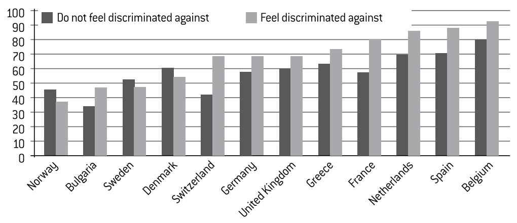 Therefore, multicultural policies do not necessarily eradicate the notion of perceived discrimination. This surprising result can be explained by the fact that the feeling of being discriminated against does not only result from public policy: we must also assume that it depends on the personal, everyday experiences of the individual. Having said that, neither did we find any correlation between the levels of perceived discrimination and levels of hostility in public opinion, as measured by the Pew Research Center in its Hostility Index. Perhaps another explanation is therefore more appropriate, one that sees multicultural policies to blame for fostering a sentiment of discrimination by placing too much emphasis on ethno-religious identities. Such an explanation is consistent with the data gathered, since we can observe that a sense of belonging to a minority group is often accompanied by a sense of being the victim of discrimination. In the Netherlands, for example, where perceptions of discrimination are widespread, 29% of the Muslims who believe that they belong to a minority group feel that they are also victims of discrimination, as opposed to only 12% among those who do not feel like they members of a minority. In short, pro-minority policies can make individuals more sensitive to the issue of discrimination, fostering among them a certain image of life in their society.