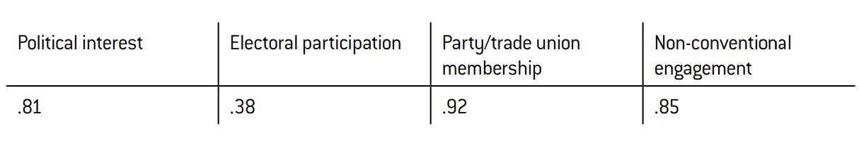 The relationship of the respondents with politics can be defined by studying four indicators: interest in politics, electoral participation, membership of a political movement or trade union, and participation in protests (such as a demonstration or a boycott) (Annex 4).