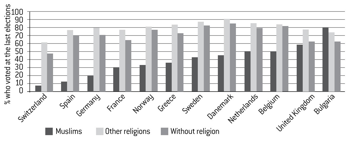 The low levels of political participation displayed by Muslims are particularly visible when they are offered the chance to vote (Annex 4). At election time, the Muslim turnout is considerably lower than for the rest of the population. In Switzerland, 21% of eligible Muslims turned out to vote at the last elections, compared with 66% of the rest of the population. In France, 46% voted, as opposed to 76% of non-Muslims. The participation rate is higher in Belgium (72%), where voting is compulsory, and in Bulgaria (83%).