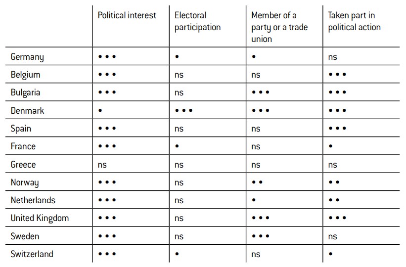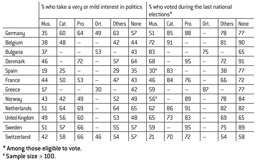 Secondly, the levels of politicisation or participation demonstrated by Muslims are generally inferior to those displayed by the rest of the population. Often, the differences between these two groups are quite considerable, but this is not to say that there are no exceptions. For example, the level of political interest shown by Muslims is relatively high in countries like France, Spain and the United Kingdom, where it is around the national average.