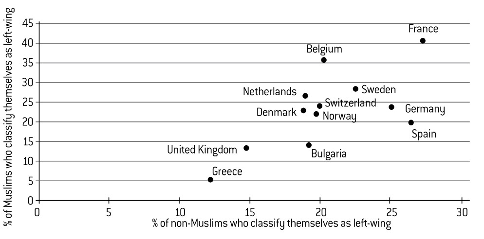 The French exception here is worthy of further investigation: why do so many of the Muslims who reside in France position themselves on the left of the political spectrum?27 Several hypotheses can be put forward: an inheritance from anti-colonial struggles; the strong ties between the right and Catholicism; left-wing sympathies to the plight of the minorities; the impact of militant associations; and the concentration of immigrants living in the so-called banlieues rouges (left-leaning suburban communes). These explanations are all perfectly plausible, but difficult to verify. A comparative analysis reveals another explanation: social context. The proportion of Muslims who classify themselves as left-wing is strongly correlated (0.76) with the proportion of the country’s population that claim to be left-wing (Graph 18). Just as for politicisation or religiosity, the political orientations of Muslims are therefore partially dependent on the overall characteristics of the country. In summary, each country has its own particular political environment that influences the political orientation of that country’s Muslims.
