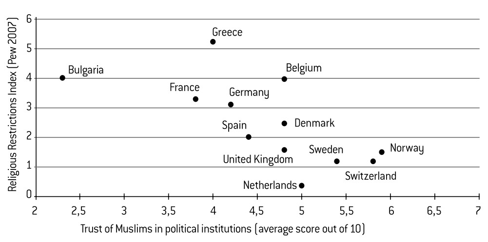 Economic and social difficulties do not, therefore, inspire an attitude of distrust. Furthermore, the trust of Muslims – in others and in institutions – seems to exist independently from their social situation: whatever the country, trust appears to be only slightly influenced by the respondents’ level of studies or income. Trust cannot be said, therefore, to be conditioned by social situation. On the other hand, the level of trust expressed by Muslims is closely linked to the level of trust displayed by the rest of the population. The degree of correlation reaches 0.94 for trust in others and 0.86 for trust in public institutions. The overall context of the country therefore has a major influence in this regard. Furthermore, trust is influenced by the actions of the countries themselves: the level of trust in political institutions is negatively correlated (–0.67) to the indicator concerning religious restrictions. In other words, the more restrictive the state’s policy with regard to religion, the stronger the Muslims’ distrust in political institutions becomes (Graph 19).