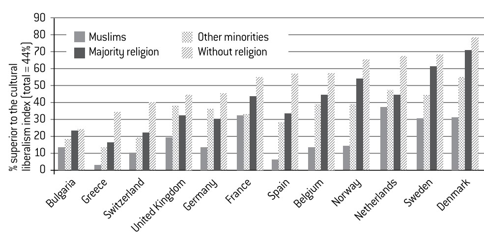 Their views on this regard are nevertheless noticeably different to those held by the rest of the population. This can be verified by devising a synthetic index on cultural liberalism. The index has been created by combining all the responses to the three questions relating to morals (Graph 21). The singularity of the Muslims is even more apparent since, in many countries, the attitudes shown by other religions towards cultural liberalism tend to more closely resemble those shown by non-believers. In this sense, Muslims are relatively isolated in their defence of traditional values. It is worth noting as an aside that France’s Muslims are among Europe’s most morally liberal.