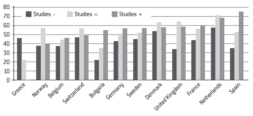 This explanation certainly contains an element of truth, since Muslims often come from modest backgrounds. However, the data still advises caution on this regard. The proportion of Muslims who declare themselves to be “very religious” varies slightly – and unevenly – depending on their social situation. This is the case if we look at levels of education (Graphic 12) but also levels of income. In at least half of the countries (Belgium, Sweden, France, United Kingdom, Spain, Germany), religiosity has practically no correlation with the level of studies. In particular, undertaking higher education does not automatically lead to a lower level of religiosity – far from it.