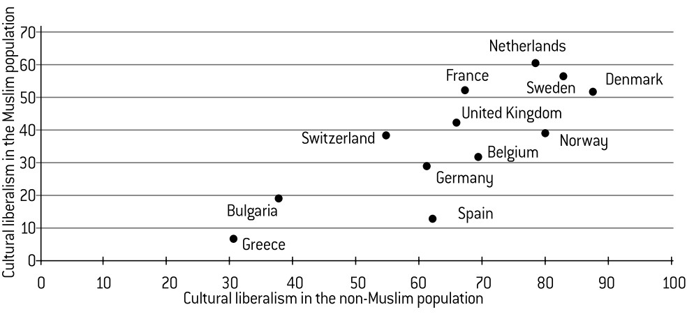 The opinions of Muslims are not static, and they depend to a certain extent on the surrounding social climate, since the correlation between the cultural liberalism of Muslims and that of the general population is very strong, as high as 0.80 (Graph 23).