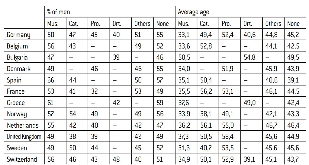 The socio-demographic characteristics of Muslims vary depending on their country of residence, but they do demonstrate certain common features. Muslim populations tend to be younger and more predominantly male than the rest of the country, which can be explained by their recent migrant background and a higher fertility rate (Annex 1). It is difficult to gauge the implications of this over-representation of men and young people, but it can be assumed to have some level of impact, particularly on the place occupied by this group in processes of education and socialisation.