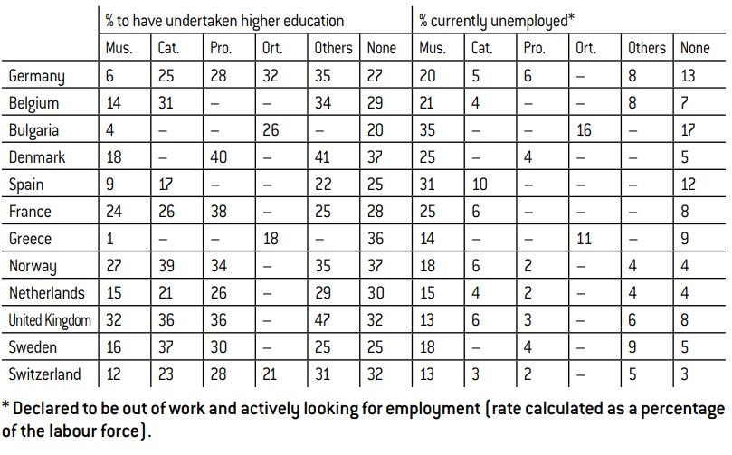 Muslims also hold less qualifications than the native population, although this also varies significantly from country to country. The proportion of Muslims who have undertaken higher education varies from 1% in Greece to 32% in the United Kingdom. In France, nearly a quarter of Muslims undertake higher education, which is more than in Germany (6%) or Sweden (16%).