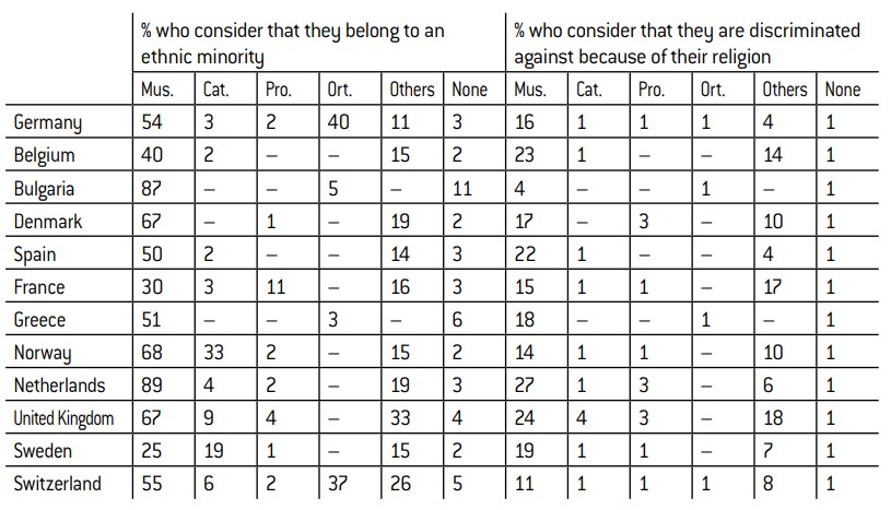 Contrary to perceived wisdom, religion appears to occupy a very prominent place in the lives of the Muslim population. The causes of this religious vigour are difficult to grasp. At the present time, there is nothing to say that they will be found exclusively, or even principally, within the internal mechanisms of European societies, whether in relation to perceived discrimination or distrust of institutions. Certainly, the feeling of being discriminated against is relatively commonplace among Muslims, but it only concerns a minority of people. Furthermore, we have observed no particular distrust towards public institutions, and any notion of distrust in the police is unsustainable. Finally, the level of religiosity does not seem to be affected by restrictive state policies towards religion.