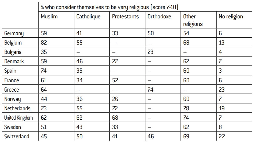 We will therefore start from the assumption that Muslims in Europe do not constitute one homogeneous block, not just because they come from diverse backgrounds linked to historic migrations (the Turks who travelled to Germany, North Africans who ended up in France, Asians in England, and so on) but also because, as with other minorities, Muslims are influenced by the cultural context in their country of residence. However, neither can we discount the impact of religion, above all in these modern times characterised by a resurgence of religiosity among Muslim populations, as evidenced by surveys carried out in France that are confirmed by the ESS data, as we will see later on.12