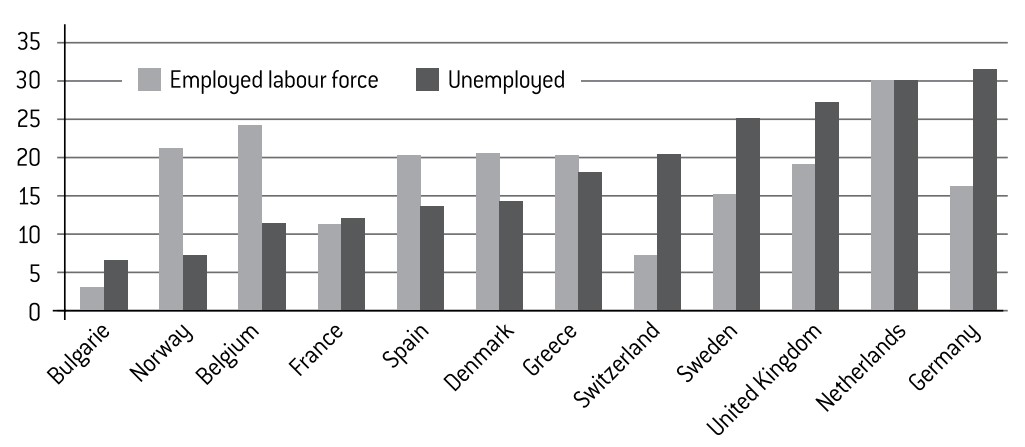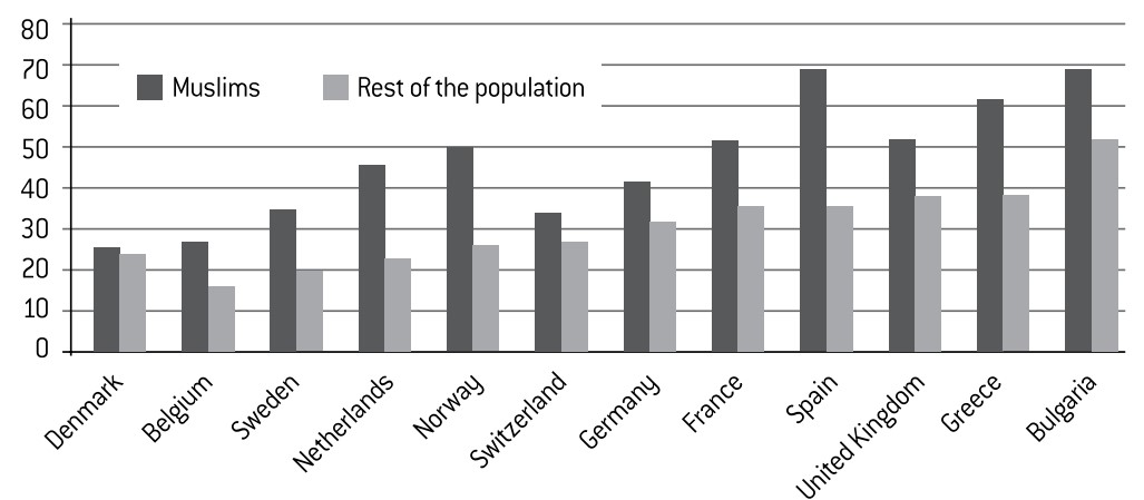Muslims find it hard to access the job market.17 Their unemployment rates vary from 13% (in the United Kingdom and Sweden) to over 30% (Spain and Bulgaria). Everywhere, the unemployment rate among Muslims is much higher than among the rest of the population.