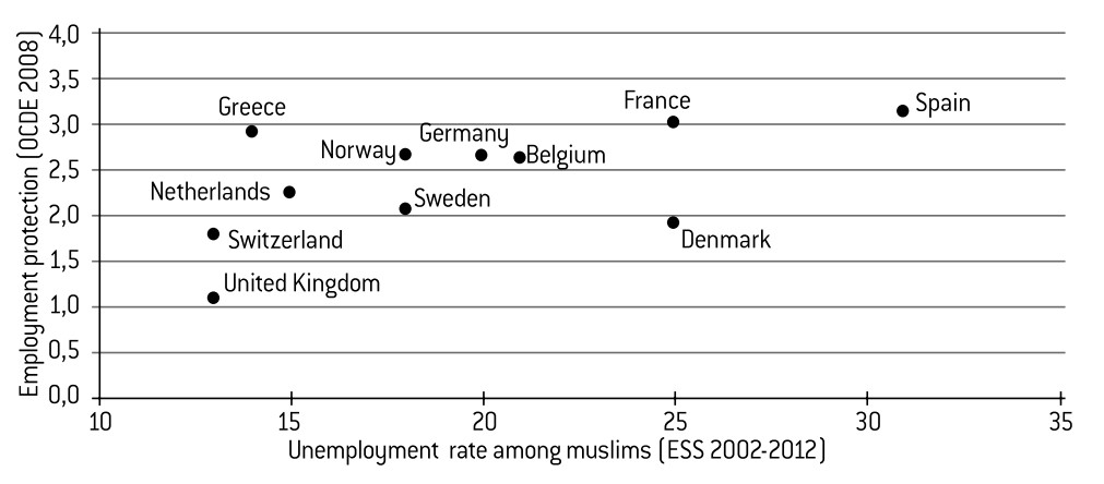 We have tried to confirm whether there is a link between unemployment and the flexibility of the job market (Graph 3). To do so, we cross-referenced the unemployment rate with the OECD employment protection index.18 There is an underlying trend: the more flexible the job market, the lower the unemployment rate. As far as France is concerned, the level of protection afforded to employees does not seem to aid the employment prospects among an often under-qualified Muslim workforce. It can nevertheless be observed that, even for those countries with a similar level of employment regulation, unemployment rates vary greatly (for example, between Switzerland, Sweden and Denmark, or between Greece, France and Spain). It is therefore unclear whether deregulating the labour market is an adequate solution to the problem of professional insertion.