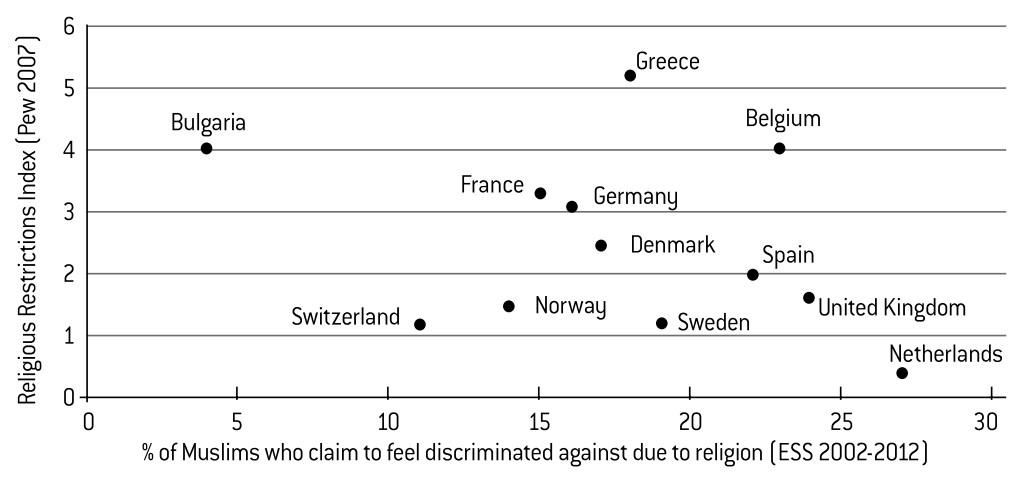 The difficulty, however, is in establishing the dynamics behind this correlation. Can a phenomenon affecting only the minority (perceived discrimination) be the cause of a more widespread trend (religiosity)? The opposite hypothesis – the idea that a high level of religiosity results in increased sensitivity, exacerbating feelings of discrimination – should not be ruled out either: the more religious people become, the more receptive they are to the idea that their faith is looked down upon or unfairly Finally, let’s add one more conflicting element: we have not observed a correlation, at an aggregate level, between the degree of religiosity and the restrictions imposed upon religions by states. We cannot therefore conclude that showing dedication to Islam is a response to public policies concerning religion.