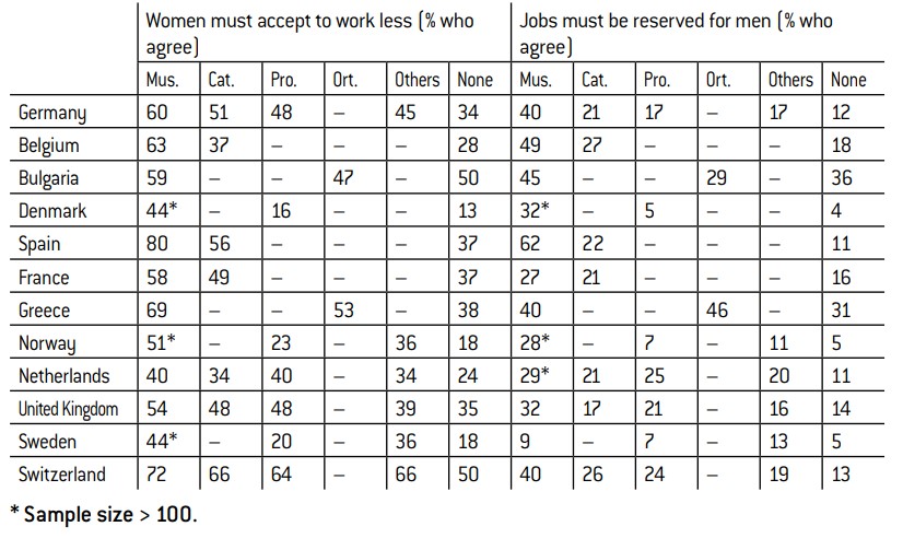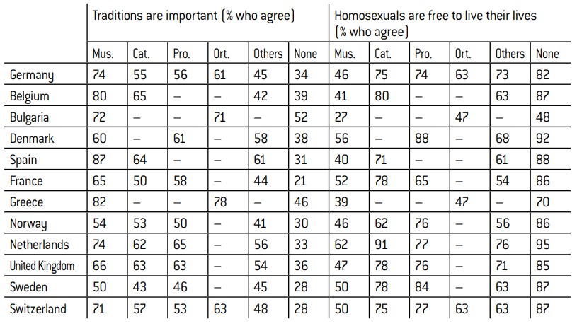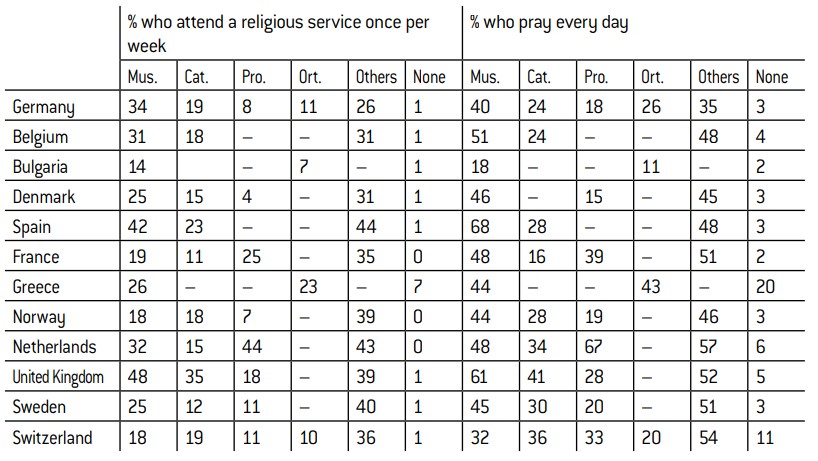 Abreviations used: Mus. (Muslim), Cat. (Roman Catholic), Pro. (Protestant), Ort. (Eastern Orthodox), None (without religion). A dash (–) in a box indicates that the sample size is insufficient (under 100 respondents).
