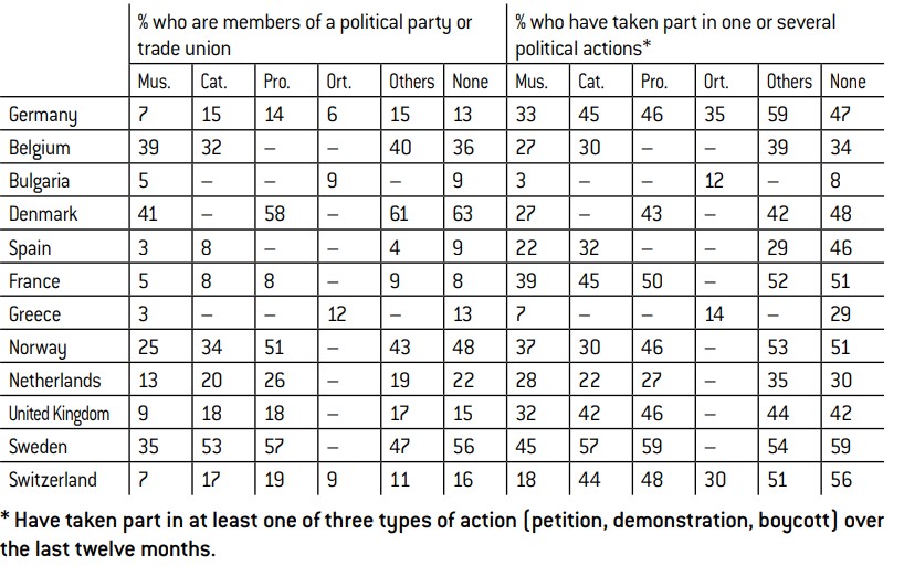 strong variations between Muslims of different countries. The level of interest in politics is, for example, very low in Greece (17% of Muslims claim to be interested in politics), whereas it is a lot stronger in the Netherlands and Sweden (51%). There are also significant differences regarding the membership of associations: in Spain and Greece, only 3% of Muslims are members of a party or trade union, while a much higher proportion are registered with such organisations in Sweden (35 %), Belgium (39 %) and Denmark (41 %). Participation in protests (having been involved in various forms of political action) varies from 3% in Bulgaria to 39% in France, and as high as 45% in Sweden.