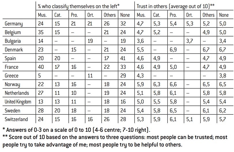 Muslims are less politicised, and participate less in politics, than other groups. They are rarely sympathetic to right-wing politics, particularly in France where the left enjoys considerable support from the county’s Muslim population. In contrast to what we may have thought, Muslims display high levels of trust in public institutions, including the police. With respect to morals, the opinions of Muslims are more traditionalist than those held by the rest of the population. In a more general sense, it seems that the attitudes of Muslims to a certain extent resemble the attitudes displayed by the population of the country of residence, suggesting that the Muslim religion is not entirely immune to change. Nevertheless, it remains difficult to anticipate future developments due to the unpredictable dynamics of religiosity.