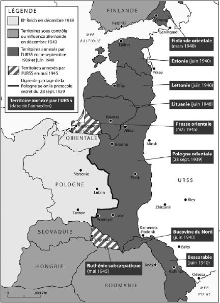 L’attaque allemande oblige Staline à accepter le soutien politique et matériel des deux grandes puissances capitalistes, l’Angleterre puis les États-Unis, après leur entrée en guerre le 7 décembre, dans le cadre de la Grande Alliance. En dépit des gigantesques défaites militaires de l’Armée rouge, il n’a pas l’intention de perdre ses conquêtes, fruits de l’alliance avec Hitler. Quand en décembre 1941 il reçoit au Kremlin le ministre britannique des Affaires étrangères Anthony Eden, il lui signifie qu’à la sortie de la guerre l’URSS conservera ses frontières d’avant le 22 juin 1941 et le Britannique n’a d’autre choix que d’acquiescer. Après les victoires soviétiques de février 1943 à Stalingrad puis de juillet à Koursk, Staline reprend sa stratégie offensive d’annexion et d’expansion. Les conférences internationales de Téhéran fin novembre 1943, de Yalta en février 1945 et de Potsdam en juillet 1945 entérineront les frontières de 1941, auxquelles Staline ajoute la Ruthénie subcarpatique, enlevée à la Tchécoslovaquie, et une portion de la Prusse-Orientale, avec sa capitale Königsberg devenue Kaliningrad. Grâce à la présence de l’Armée rouge sur le terrain et au non-respect de ses engagements pris à Yalta pour des élections libres dans tous les pays libérés, il impose la prise du pouvoir dans toute l’Europe centrale et orientale par des équipes communistes formées au sein du Komintern, encadrées par des « conseillers » soviétiques et appuyées par la présence de l’Armée rouge « libératrice » et du NKVD/KGB. Le rideau de fer va couper l’Europe en deux pendant près d’un demi-siècle, jusqu’à ce que la chute du mur de Berlin marque l’effondrement des régimes communistes et la libération effective de ces nations.