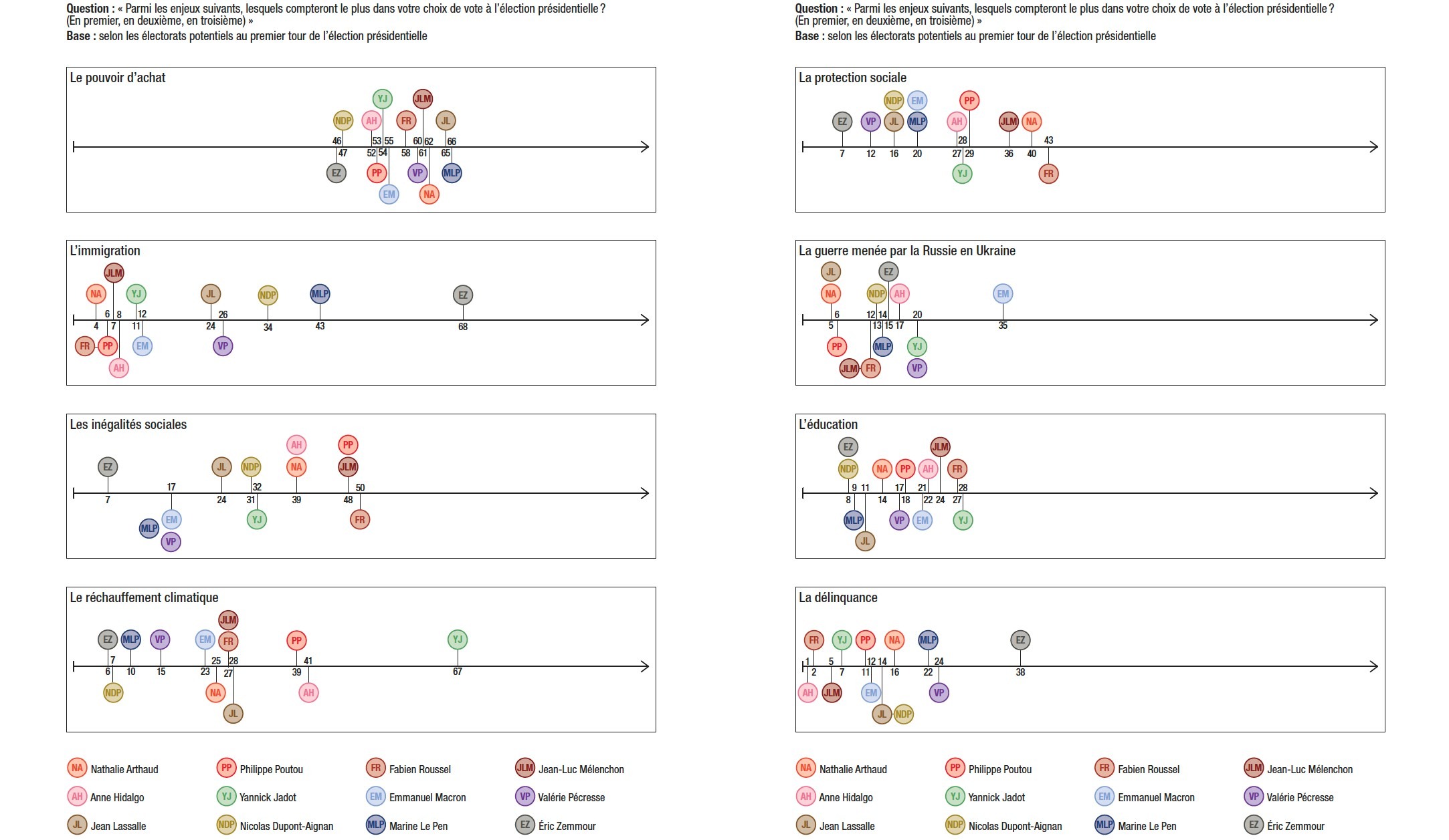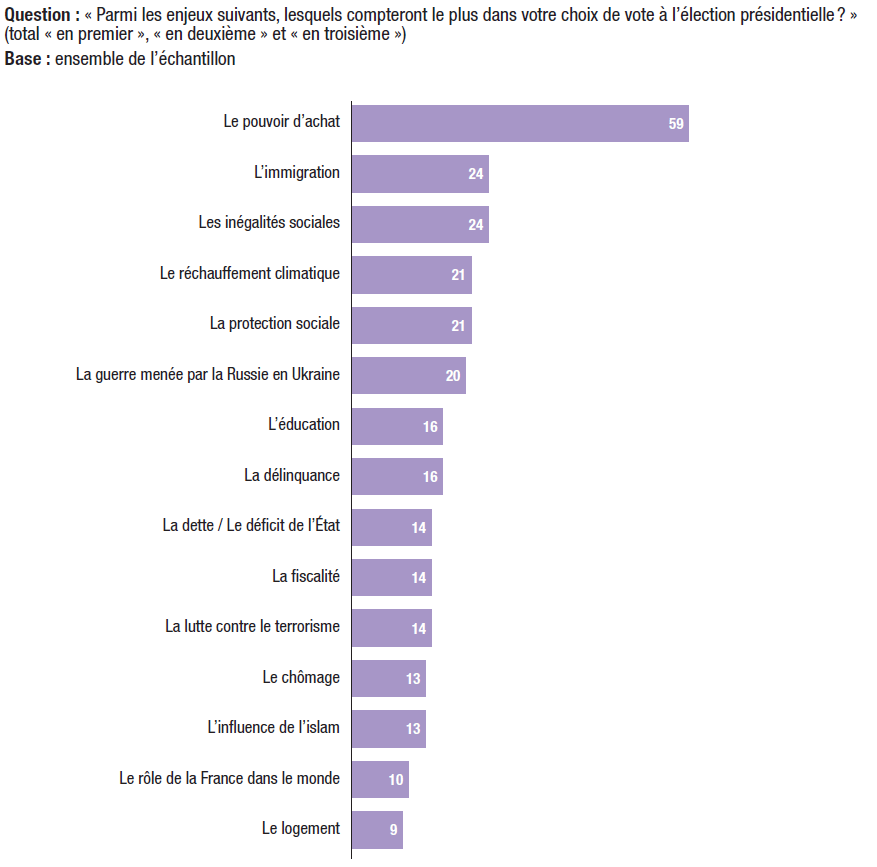 31. Le pouvoir d’achat (59%) est le principal enjeu pris en compte dans le choix des électeurs, devant l’immigration (24%) et les inégalités sociales (24%). Au sein des électorats potentiels, le pouvoir d’achat arrive partout en tête, à l’exception des électeurs potentiels d’Éric Zemmour, pour lesquels l’immigration arrive en première position (68%), et des électeurs potentiels de Yannick Jadot, pour lesquels le réchauffement climatique domine leurs préoccupations (67%). Enfin, la guerre menée par la Russie en Ukraine est davantage citée par les potentiels électeurs d’Emmanuel Macron au premier tour (35%) que par l’ensemble de l’échantillon (20%).
