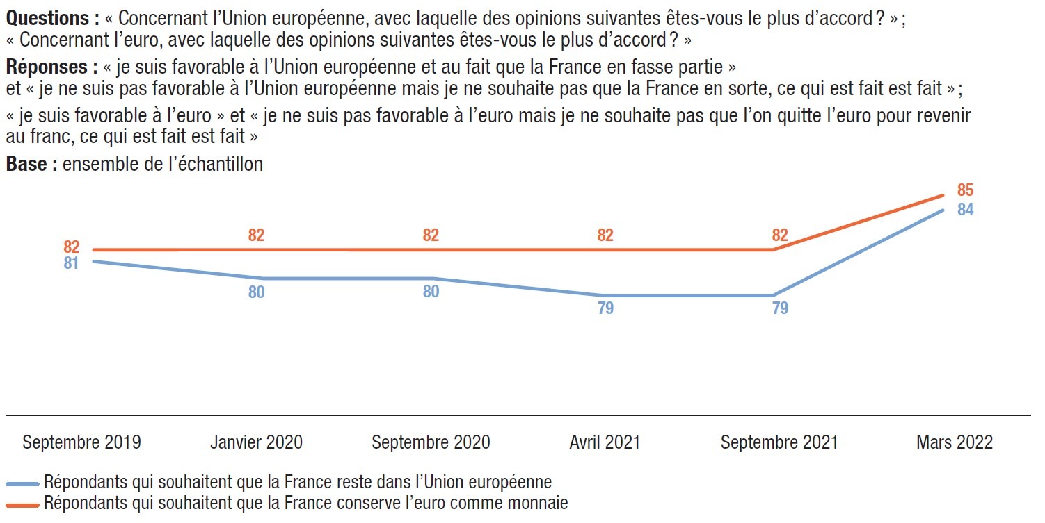 Déjà acquis dans nos vagues précédentes, le soutien à l’Union européenne et à l’euro progresse encore dans l’opinion. Il faut y voir un effet de la crise internationale qui a donné lieu à une mobilisation exceptionnelle des Européens, engagés dans un puissant mouvement de solidarité avec les Ukrainiens ; on a vu aussi l’expression inédite d’une volonté de prendre en charge la protection des Européens dans un mouvement au profit du président sortant, qui apparaissait déjà lors des élections européennes de 2019 comme le plus européen de tous les candidats.