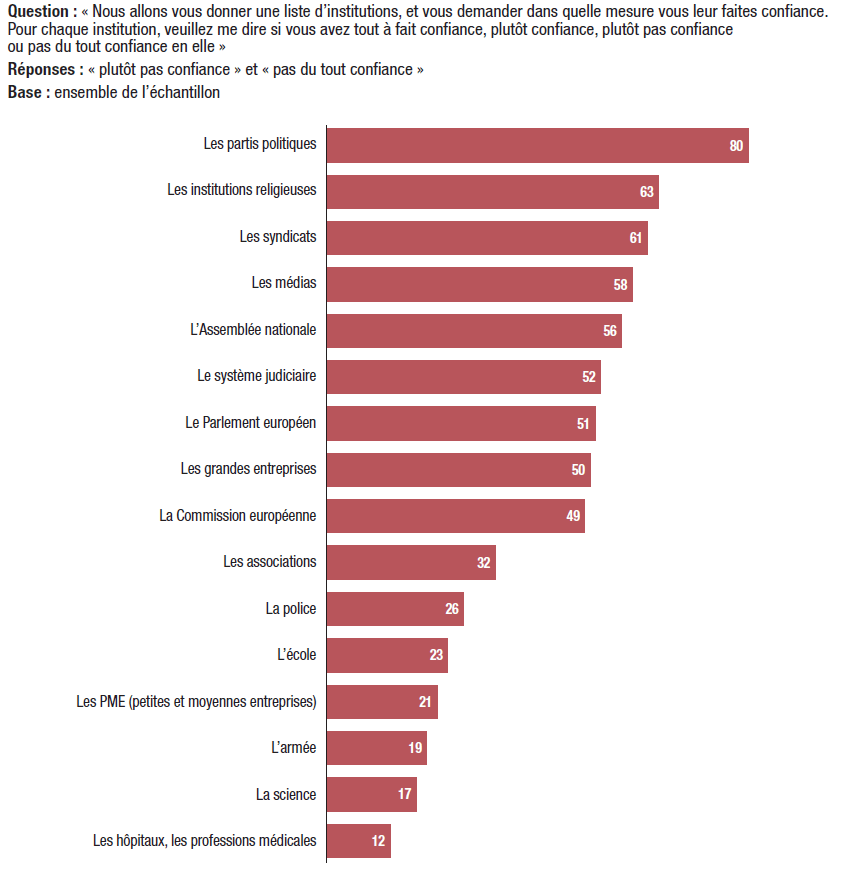 22. La défiance à l’égard des partis politiques est confirmée : 80% des personnes interrogées ne font pas confiance aux partis politiques.