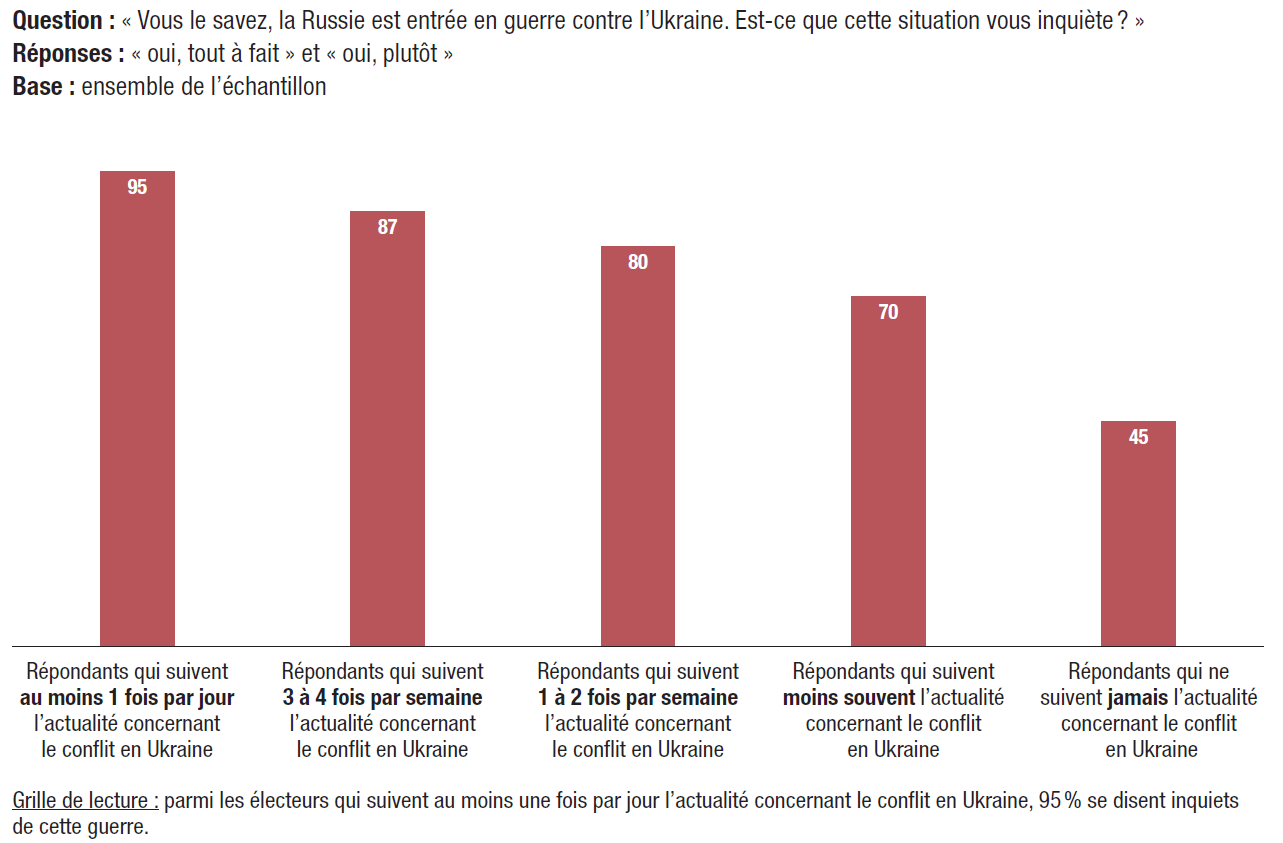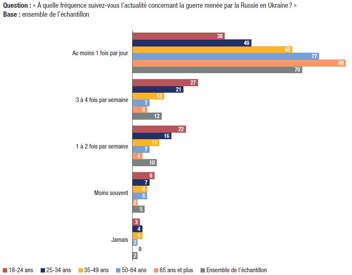 1. L’actualité ukrainienne s’impose aux électeurs. À la question : « À quelle fréquence suivez-vous l’actualité concernant la guerre menée par la Russie contre l’Ukraine ? », 70% des électeurs interrogés répondent s’informer à ce sujet au moins une fois par jour. Seuls 2% des répondants déclarent ne jamais suivre les actualités concernant ce conflit.