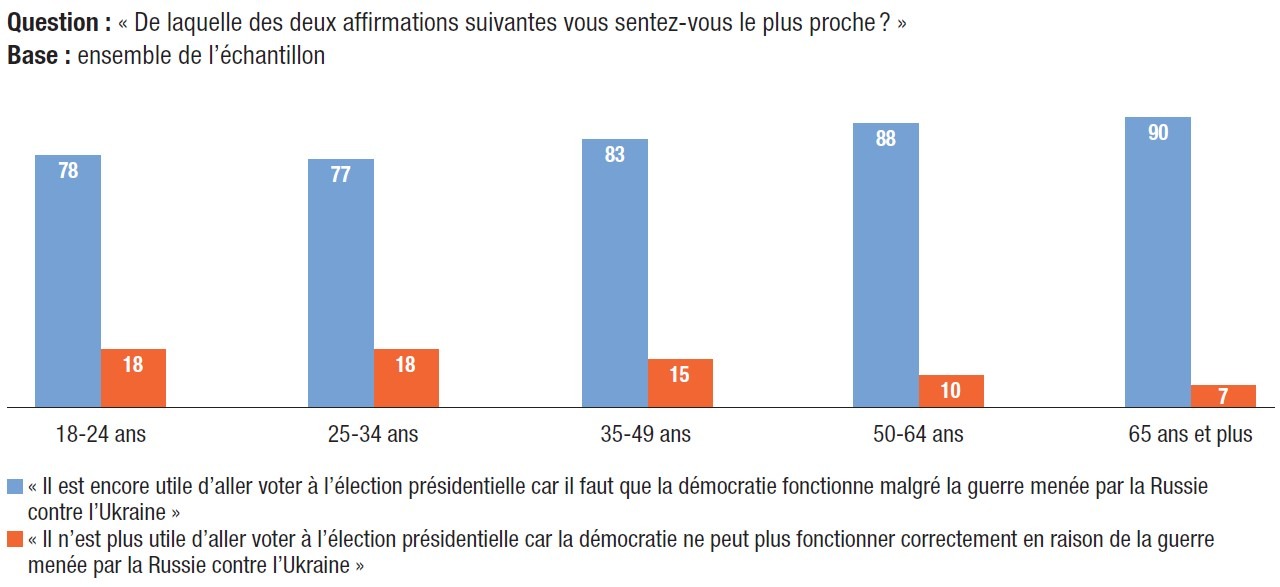Parmi les répondants qui sont les plus nombreux à dire qu’« il n’est plus utile d’aller voter à l’élection présidentielle car la démocratie ne peut plus fonctionner correctement en raison de la guerre menée par la Russie contre l’Ukraine », on trouve les « désaffiliés politiques », ceux qui ne se sentent proches d’aucun parti (17%), ainsi que les personnes qui ne se positionnent pas sur l’échelle gauche-droite (20%). Ces chiffres restent malgré tout minoritaires.