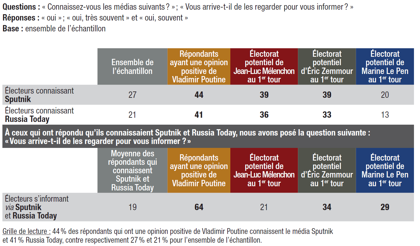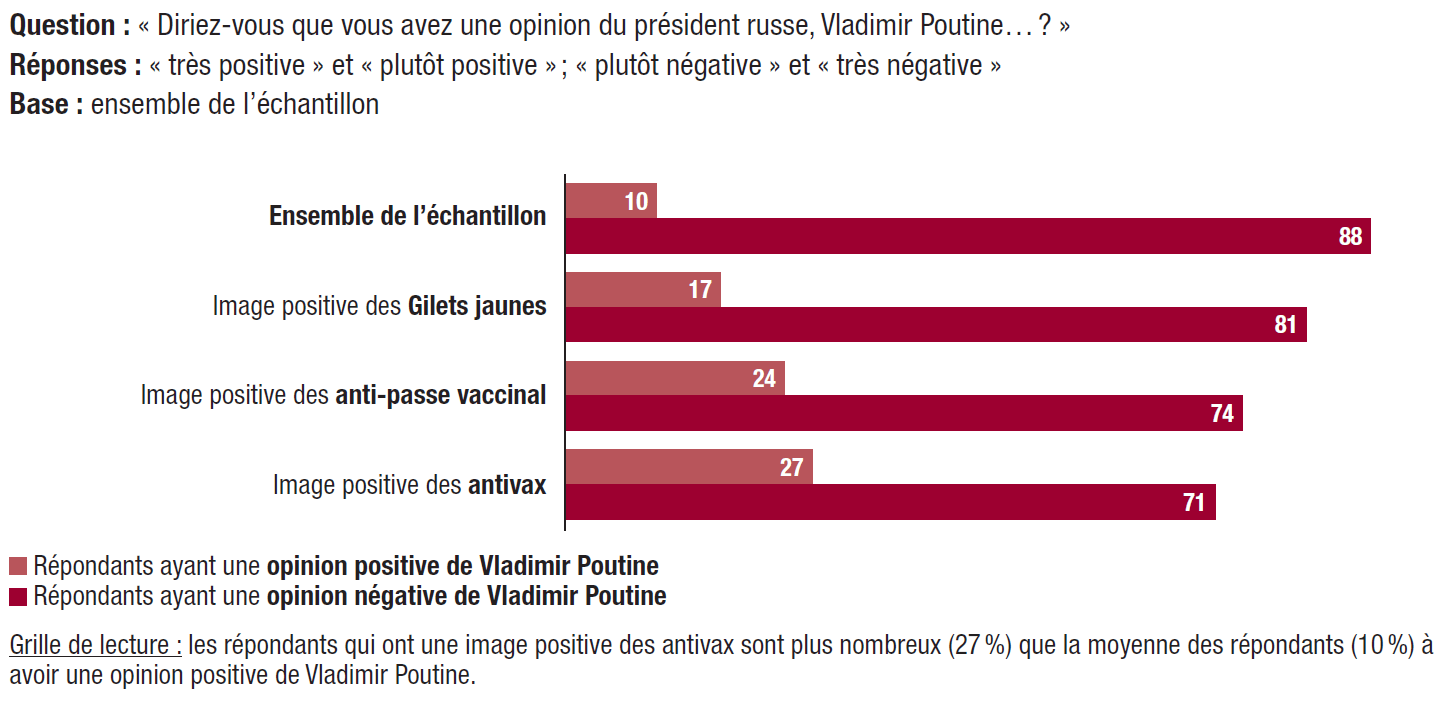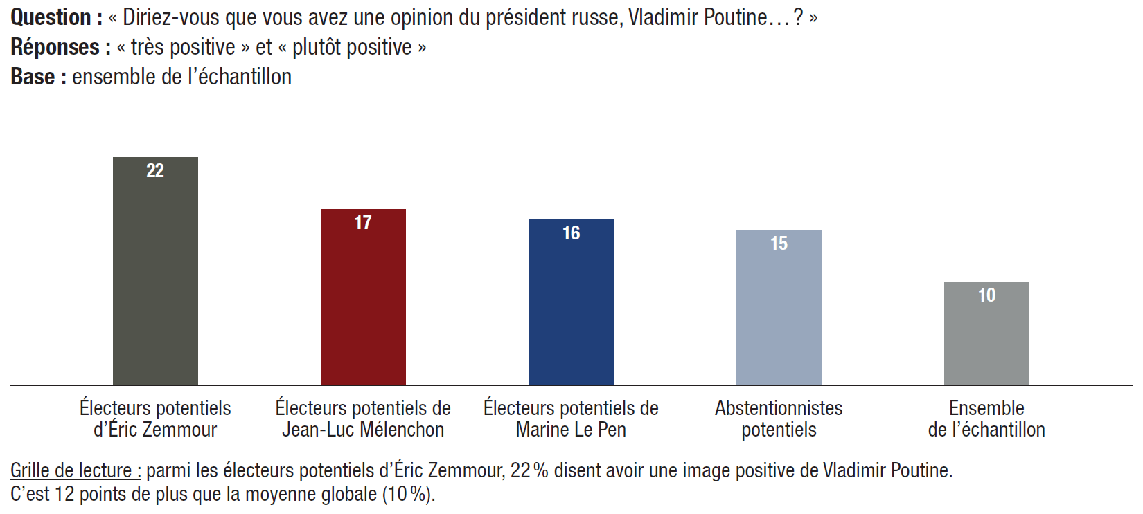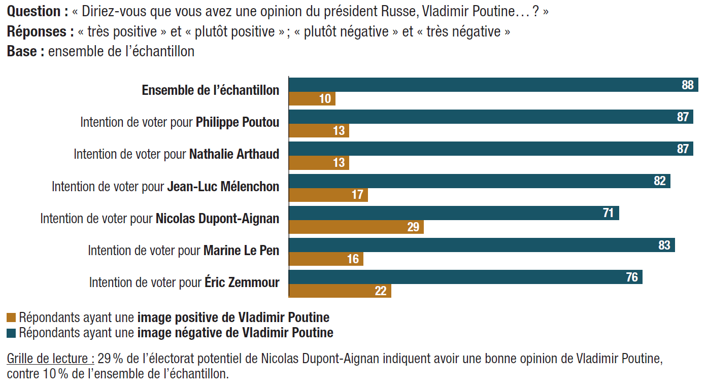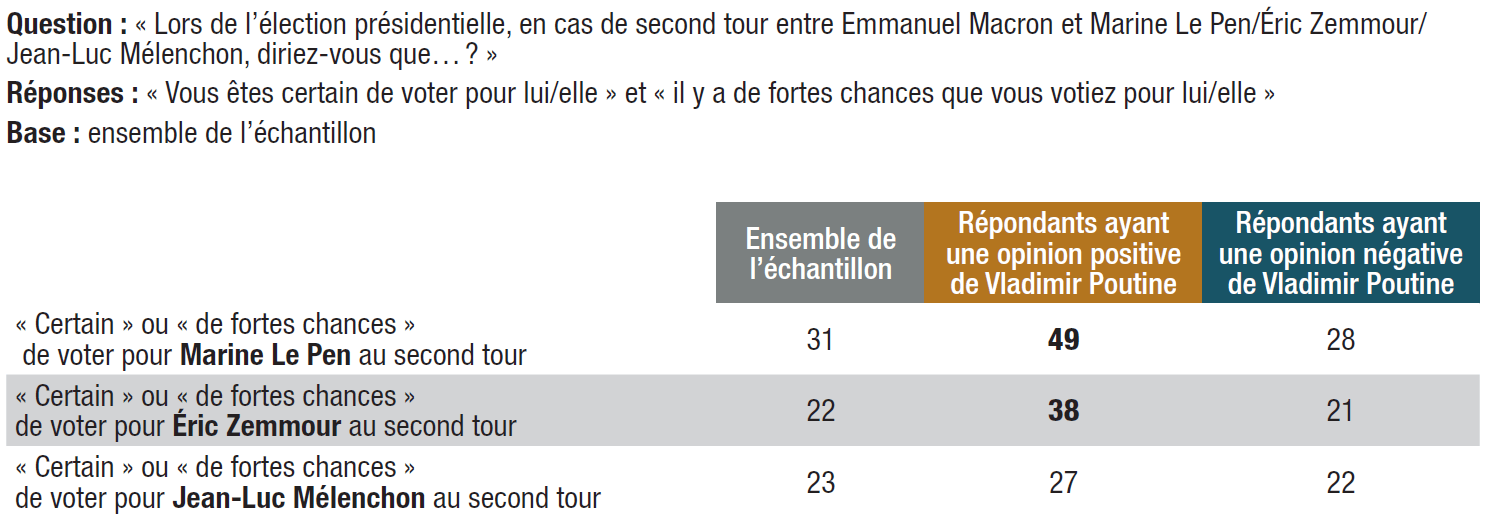 10. Des électorats sensibles au poutinisme (Zemmour, Mélenchon, Le Pen). L’opinion positive à l’égard de Vladimir Poutine est présente au sein des électorats potentiels d’Éric Zemmour (22%), de Jean-Luc Mélenchon (17%), de Marine Le Pen (16%) et de ceux qui disent vouloir s’abstenir (15%) lors du premier tour de l’élection présidentielle.