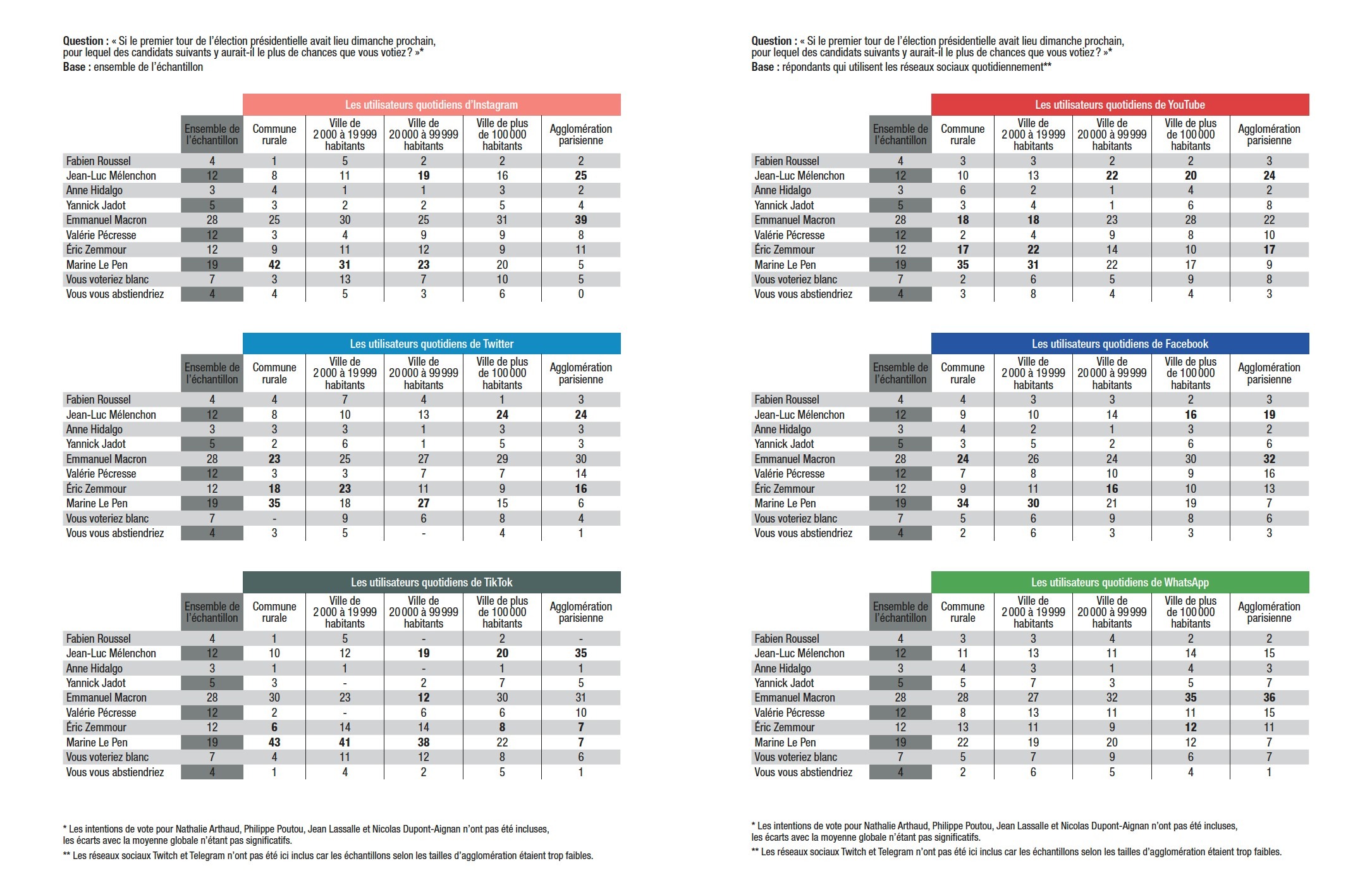 ** Les réseaux sociaux Twitch et Telegram n’ont pas été ici inclus car les échantillons selon les tailles d’agglomération étaient trop faibles.