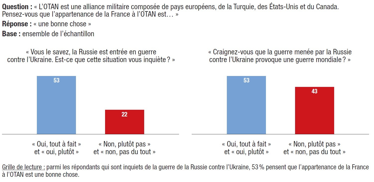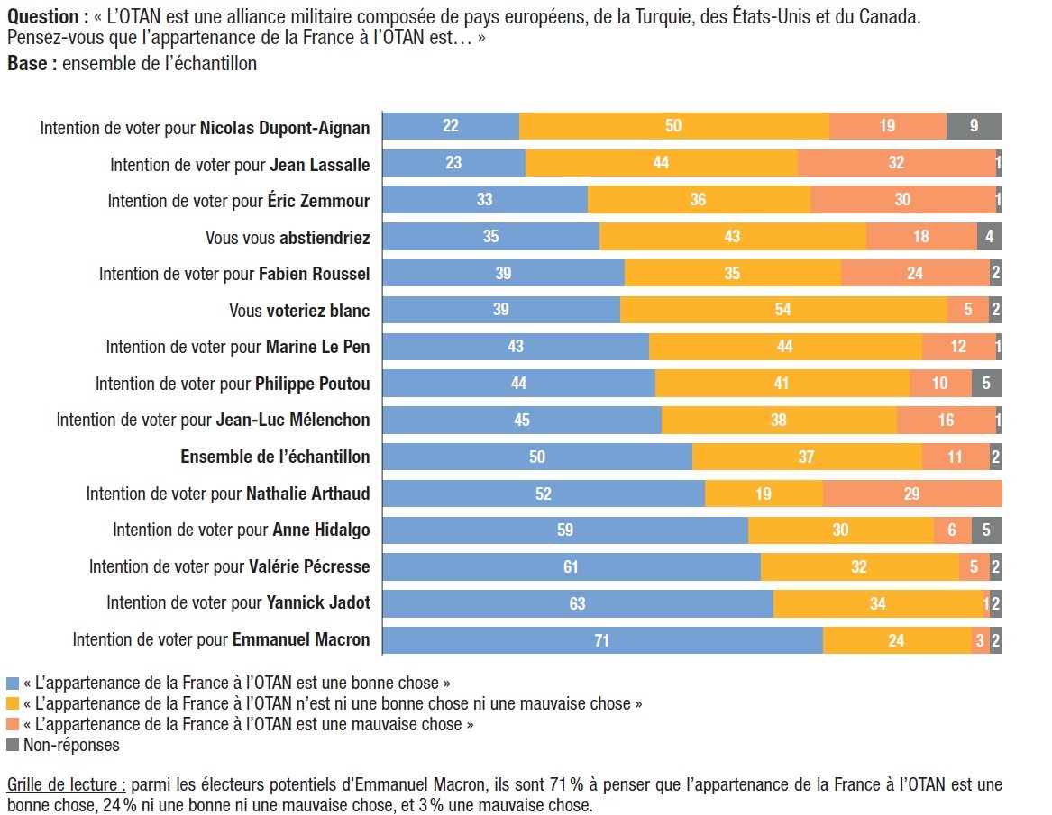 Le renforcement du soutien à l’OTAN, confortée par la guerre de Poutine en Ukraine, est un troisième élément défavorable aux candidatures protestataires. En effet, la moitié des électeurs interrogés (50%) considèrent que l’appartenance de la France à l’OTAN est une bonne chose (contre 47% en juillet 2021) ; 37% jugent que l’appartenance de notre pays à cette alliance n’est « ni une bonne ni une mauvaise chose » et seulement 11% une mauvaise chose (contre 14%).