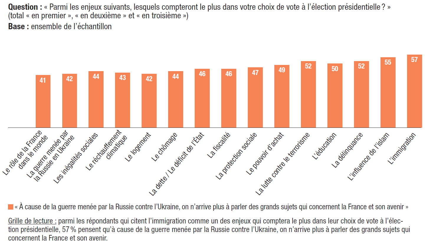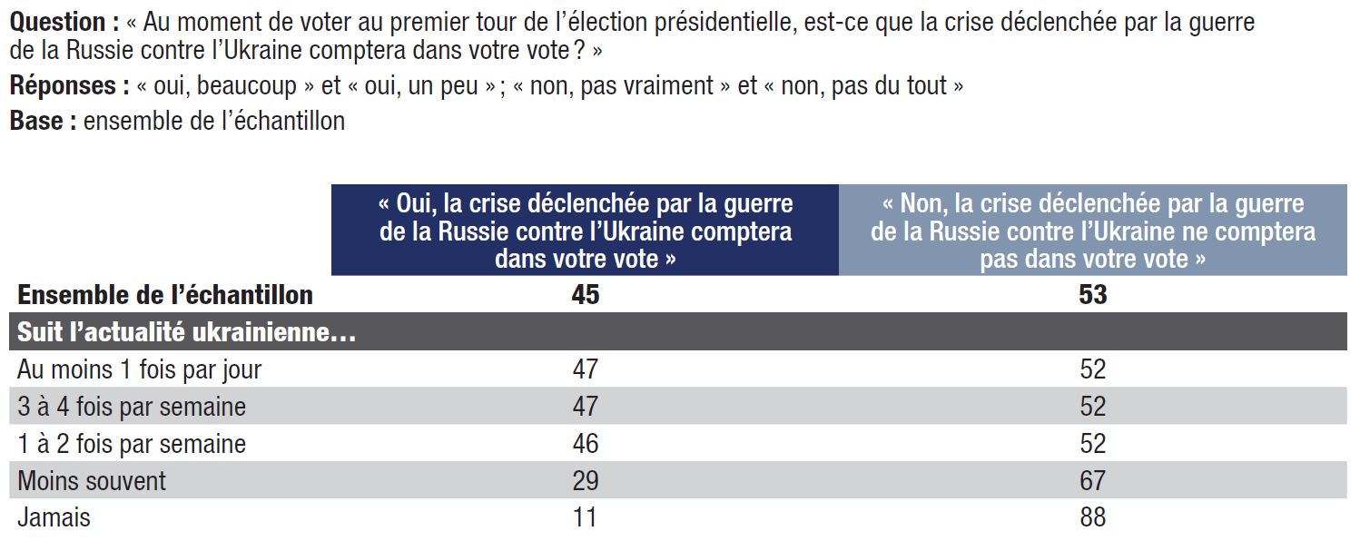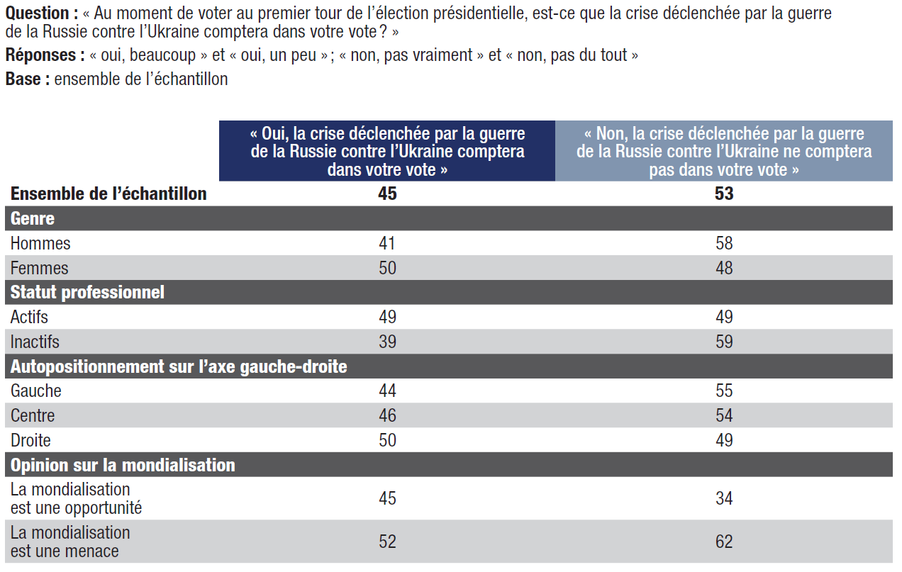 3. Les préoccupations soulevées par la crise ukrainienne ont des répercussions sur la décision électorale : 45% des répondants estiment que le conflit comptera dans la détermination de leur vote lors du premier tour. Si seulement 10% des personnes interrogées disent avoir changé leur choix de vote en raison de la guerre en Ukraine, cette proportion double (20%) chez ceux qui répondent que le conflit comptera dans leur choix au premier tour.