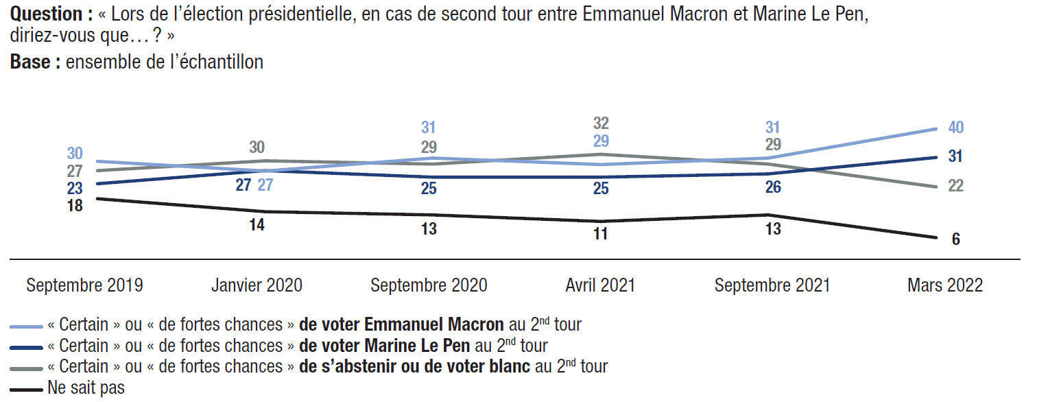 17. Dans le cadre d’un second tour opposant Emmanuel Macron à Marine Le Pen, les personnes indiquant être « certaines » ou ayant « de fortes chances » de voter pour la candidate du RN représentent 31% des personnes interrogées, soit le résultat le plus élevé de nos cinq vagues réalisées depuis septembre 2019. Sur la même période, Emmanuel Macron atteint également son résultat le plus élevé (40%).