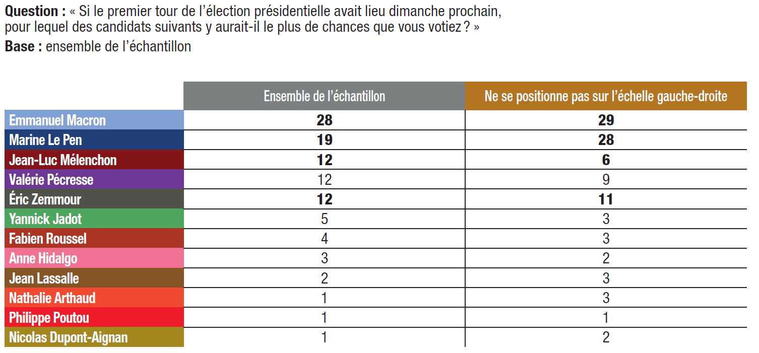 Pour le premier tour de l’élection présidentielle, le vote des électeurs se situant à droite (de 6 à 10 sur l’échelle gauche-droite) est réparti en 4 groupes principaux : 27% disent qu’ils voteront pour Emmanuel Macron (contre 28% en moyenne), 23% pour Marine Le Pen (contre 19%), 20% pour Valérie Pécresse (contre 12%), 19% pour Éric Zemmour (contre 12%) et 1% pour Nicolas Dupont‑Aignan, un niveau identique à la moyenne de son score. Ainsi, 43% des électeurs qui se considèrent de droite indiquent voter pour un candidat de la droite protestataire (Marine Le Pen, Éric Zemmour et Nicolas Dupont‑Aignan), contre 20% pour la candidate de la droite de gouvernement, Valérie Pécresse. Si les répondants qui se situent au centre (position 5 sur l’échelle) sont nombreux à dire qu’ils voteront pour le président sortant (42%), ils sont aussi 21% à dire qu’ils choisiront la candidate du RN, loin devant celle des LR (6%), Éric Zemmour (6%) et Nicolas Dupont‑Aignan (2%).