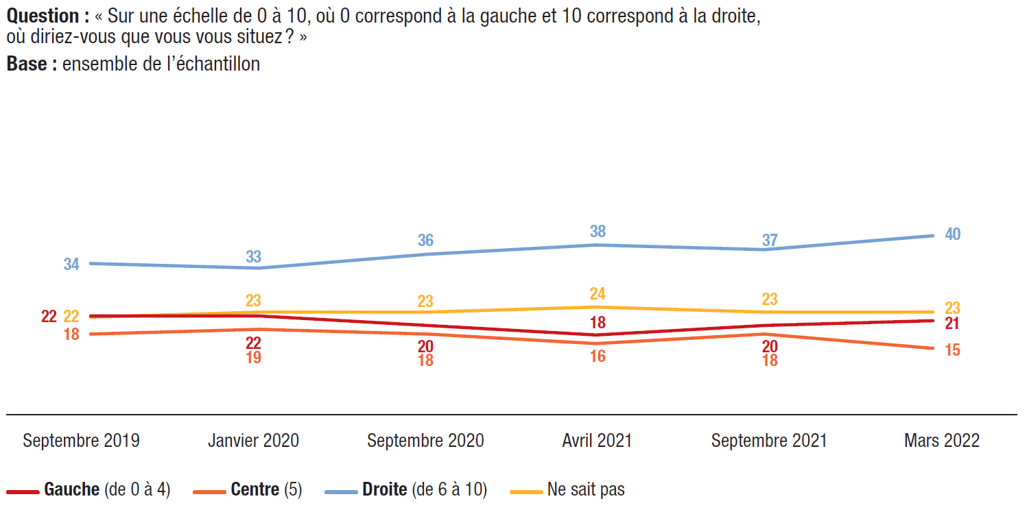 Les personnes interrogées pouvaient ne pas se positionner sur cette échelle. Un quart des répondants (23%) ont choisi de ne pas se positionner. La mise en perspective de ces données avec notre indicateur de la protestation électorale, 2022, le risque populiste en France, permet de rendre compte de l’évolution de l’autopositionnement politique. En moins de trois ans, la proportion d’électeurs se situant à droite de l’échiquier politique s’est accrue de manière significative, enregistrant son plus haut niveau en mars 2022.