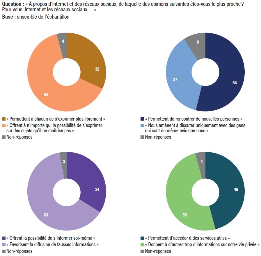34. Les électeurs ne font pas confiance aux informations circulant sur les réseaux sociaux. 64% des répondants estiment qu’ils « offrent à n’importe qui la possibilité de s’exprimer sur des sujets [que les gens] ne maîtrise[nt] pas », 63% qu’ils « favorisent la diffusion de fausses informations », 50% qu’ils « donnent à d’autres trop d’informations sur notre vie privée » et 37% qu’ils « nous amènent à discuter uniquement avec des gens qui sont du même avis que nous ».